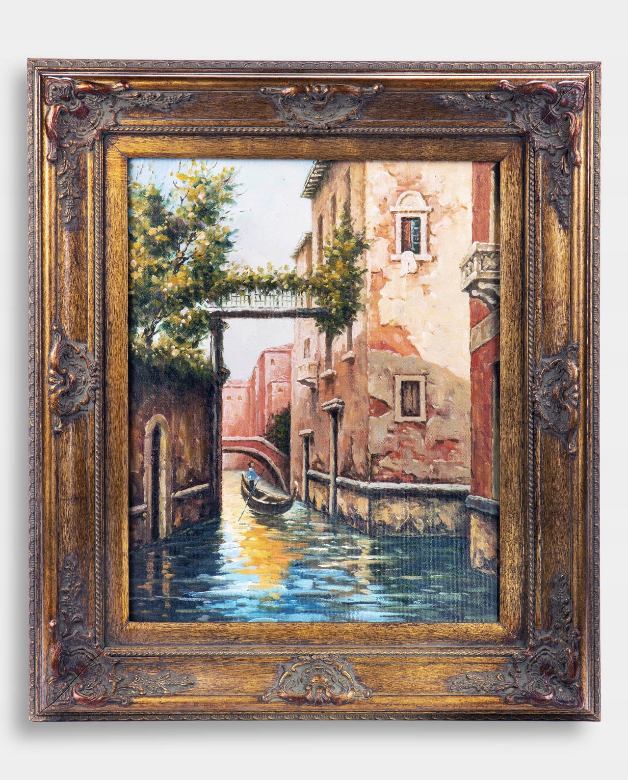 Класична картина в золотій рамі, написана олією, із зображенням міського пейзажу Венеції. Дуже романтичне і чарівне зображення цього водного міста створює дивовижну атмосферу в інтер'єрі. Він оформлений у багато декоровану та позолочену раму. Все це справляє чудове естетичне враження та має позачасовий стиль. Підходить для багатьох інтер'єрів.