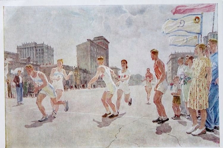 Умова: Добре Опис: листівка з малюнком "реле" відомого радянського художника Олександра Дейнека. Він створив виразний, плакатний стиль живопису. У 1930 -х роках він спроектував мозаїчні плафди для станції "Маяковська" московського метро, а в 1960–1961 роках для Кремльського палацу конгресів. Постокрава: 100 000 примірників.