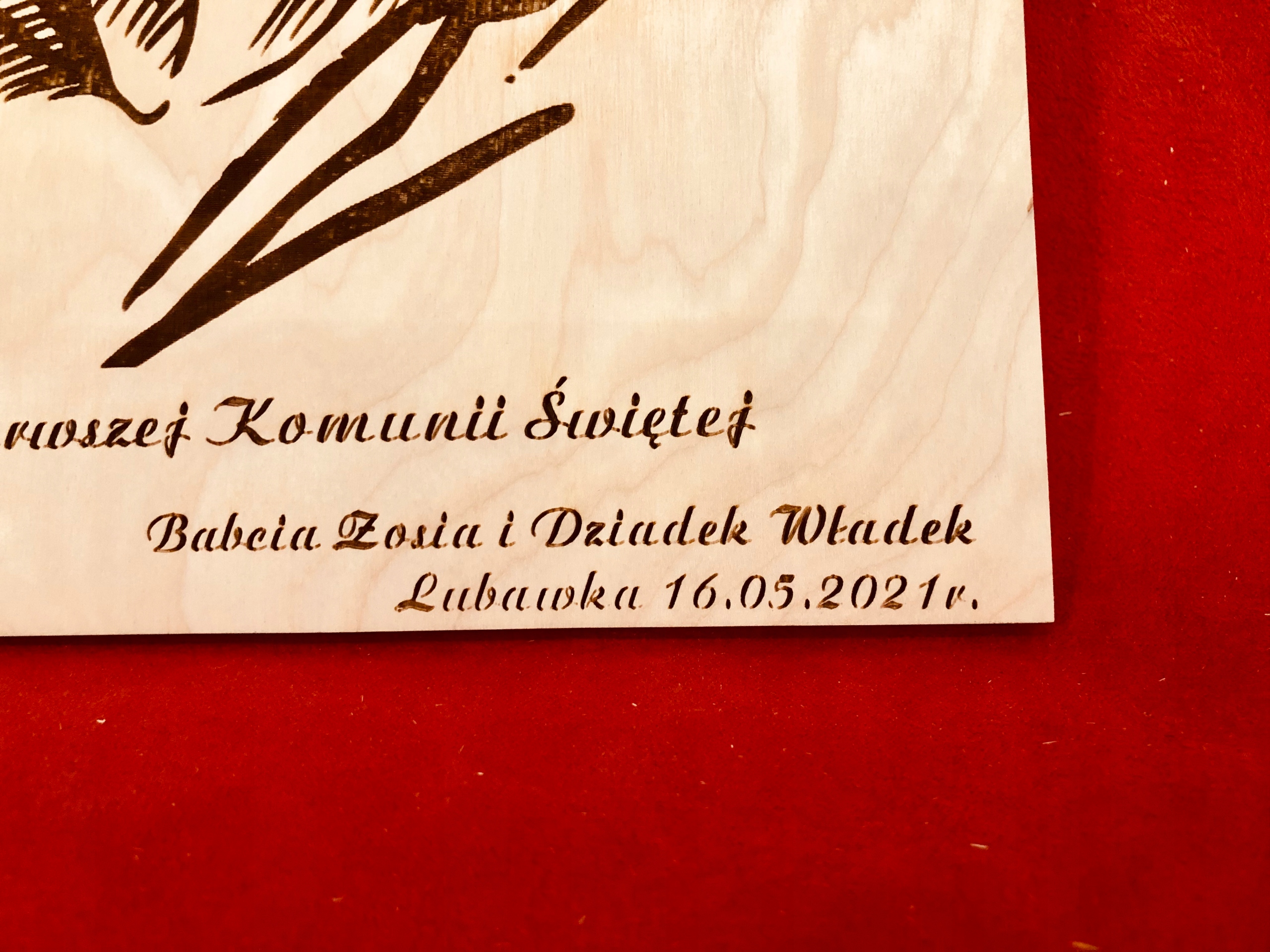 Картина виконана з фанери товщиною 3 мм. У вартість входить гравіювання тексту вашої присвяти на нижній частині зображення. Оригінальна ідея для подарунка з нагоди ПЕРШОГО ПРИЧАСТЯ, ХРИСМА, ВЕСІЛЛЯ і неодмінно стане гарним сувеніром.