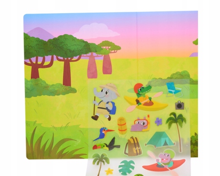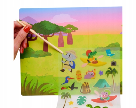 Привіт, пригода! Настав час у довгу подорож у світ диких тварин! Стимулювати свою уяву та перенесіть у світ джунглів. У набір входить двостороння дошка з фоном, 60 наклейок і паличка для обведення візерунків. Створіть захоплюючу історію за допомогою картини ручної роботи!
