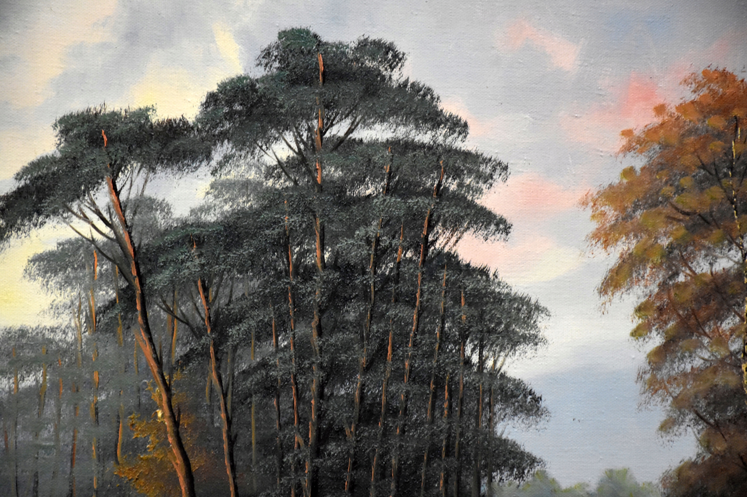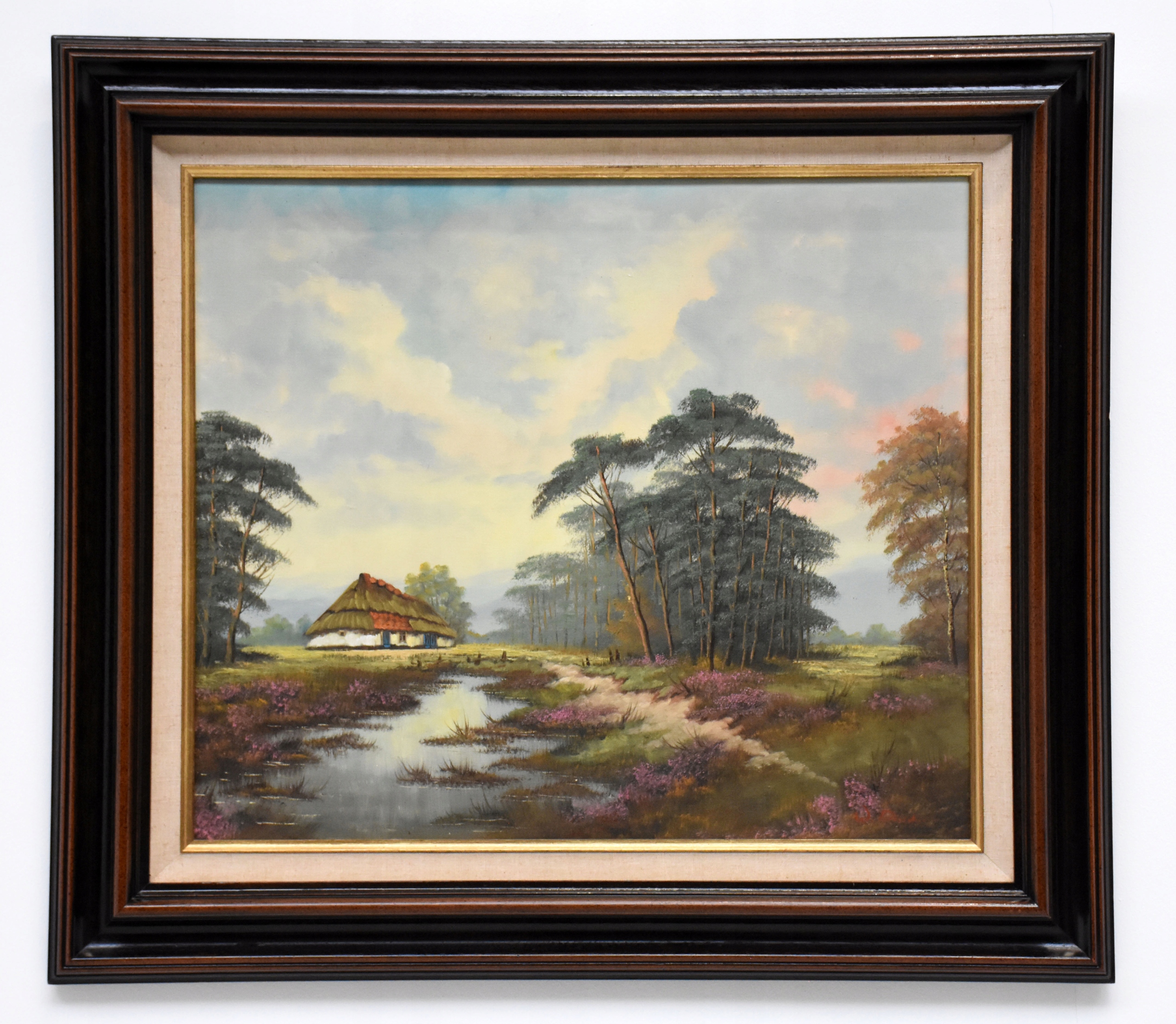 Зображення річки, лісу, котеджу, полотна нафти, рамка 83/94 см