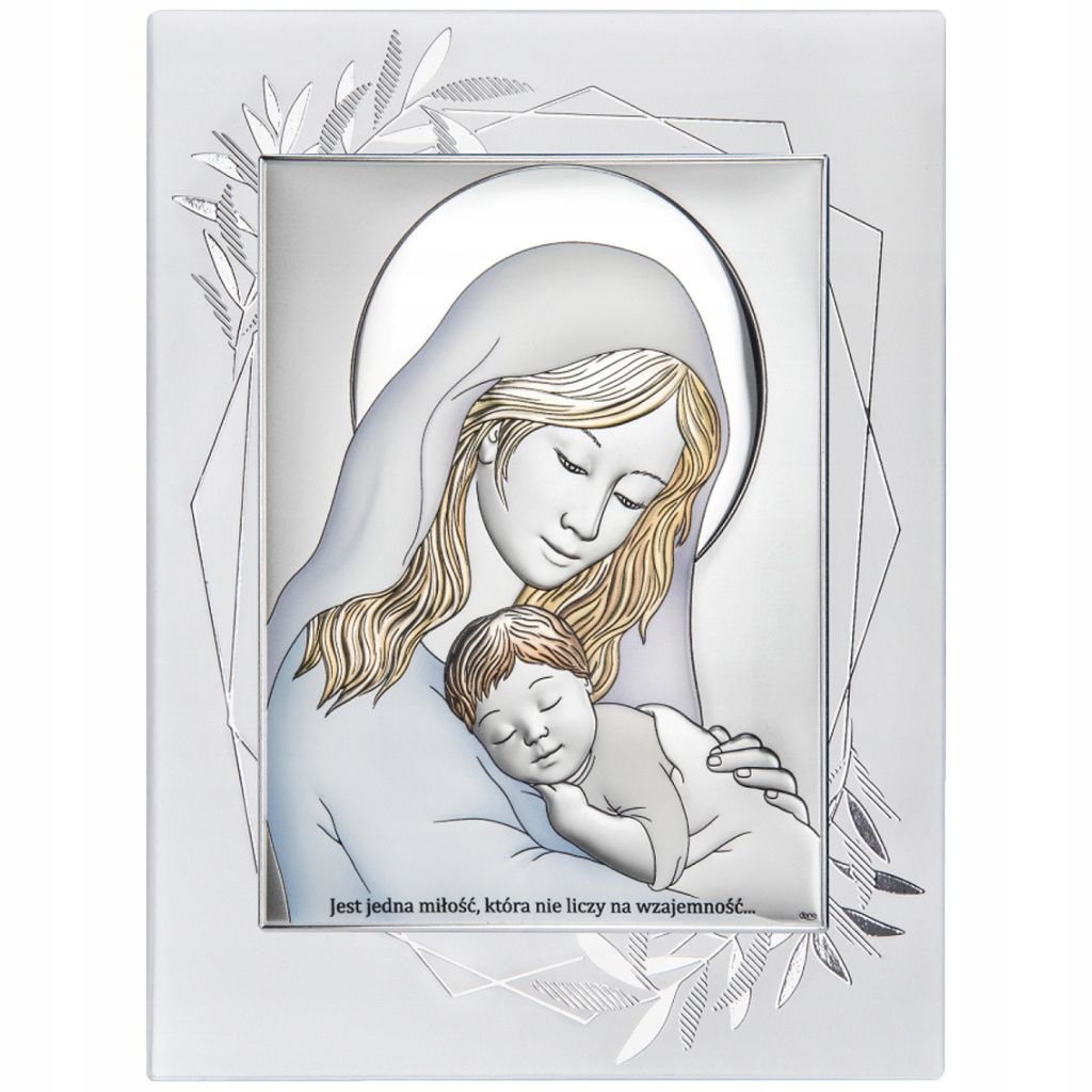 Срібна картина Богородиця з Немовлям стане чудовим сувеніром до таких важливих свят у житті кожної людини, як хрещення, миропомазання, причастя, вінчання, річниця весілля, священицькі свячення. Тонка і навіть майстерна передача деталей, таких як заломлення матеріалу, ореоли або вирази обличчя персонажів, порадує кожного щасливого покупця чи одержувача. На лицьовій стороні картини фабрично викарбувано напис: «Є одна любов, яка не розраховує на взаємність...».
