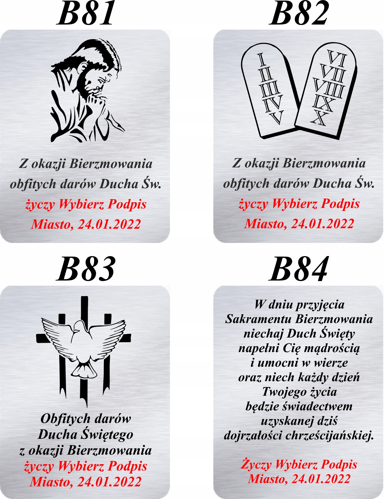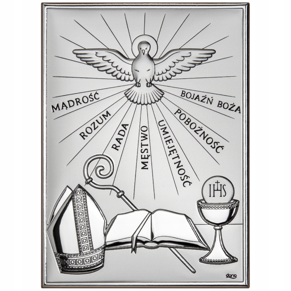 Срібний малюнок із зображенням символів, пов’язаних із конфірмацією, написом «МУДРІСТЬ, РОЗУМ, ПОРАДА, СИЛЬНІСТЬ, УМІННІСТЬ, ПОБОЖНІСТЬ, СТРАХ БОЖИЙ» є ідеальним подарунком з нагоди прийняття таїнства Христа. Підтвердження. Розмістивши на ньому вигравірувану присвяту, ви подаруєте одержувачу чудовий сувенір на довгі роки.