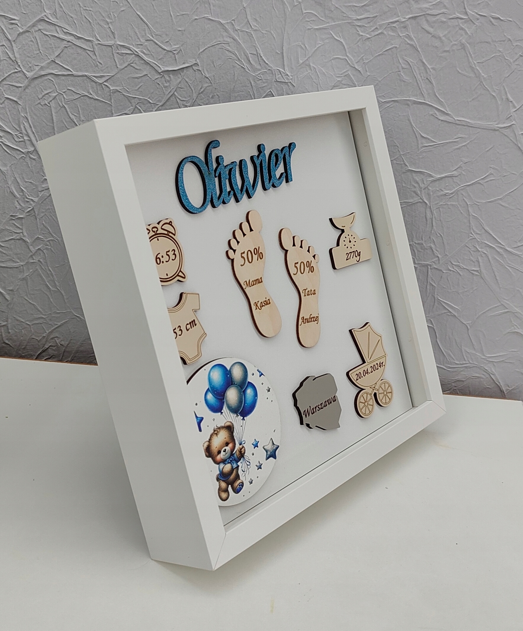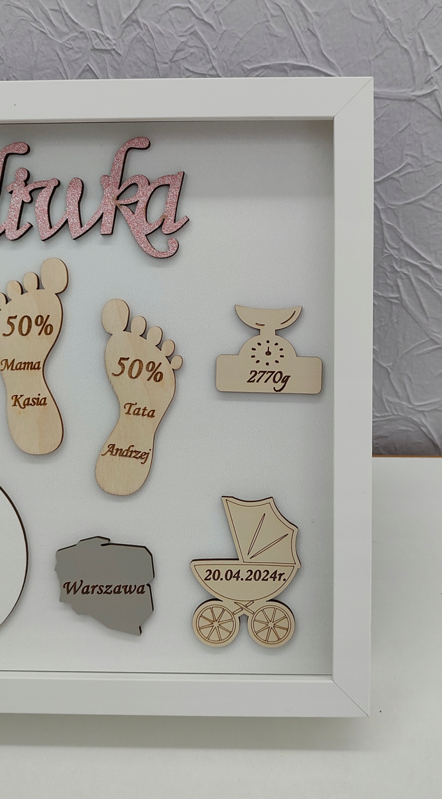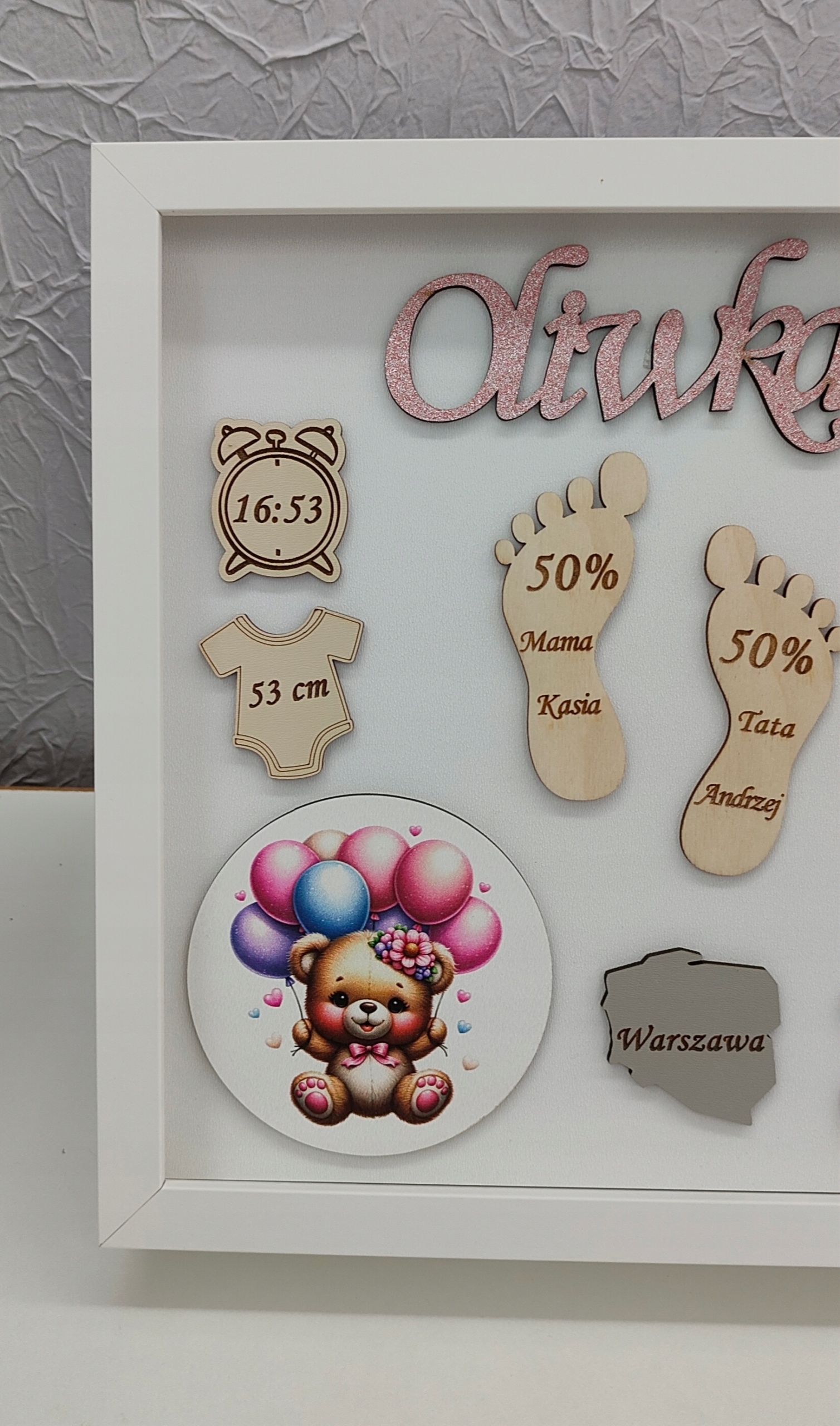 Рамка складається з комбінації кількох елементів - ультрафіолетового друку, HDF плити, фанери та блискучого імені малюка.