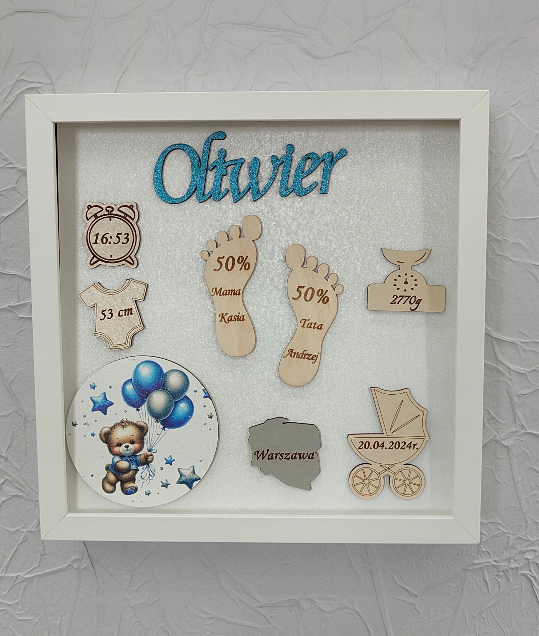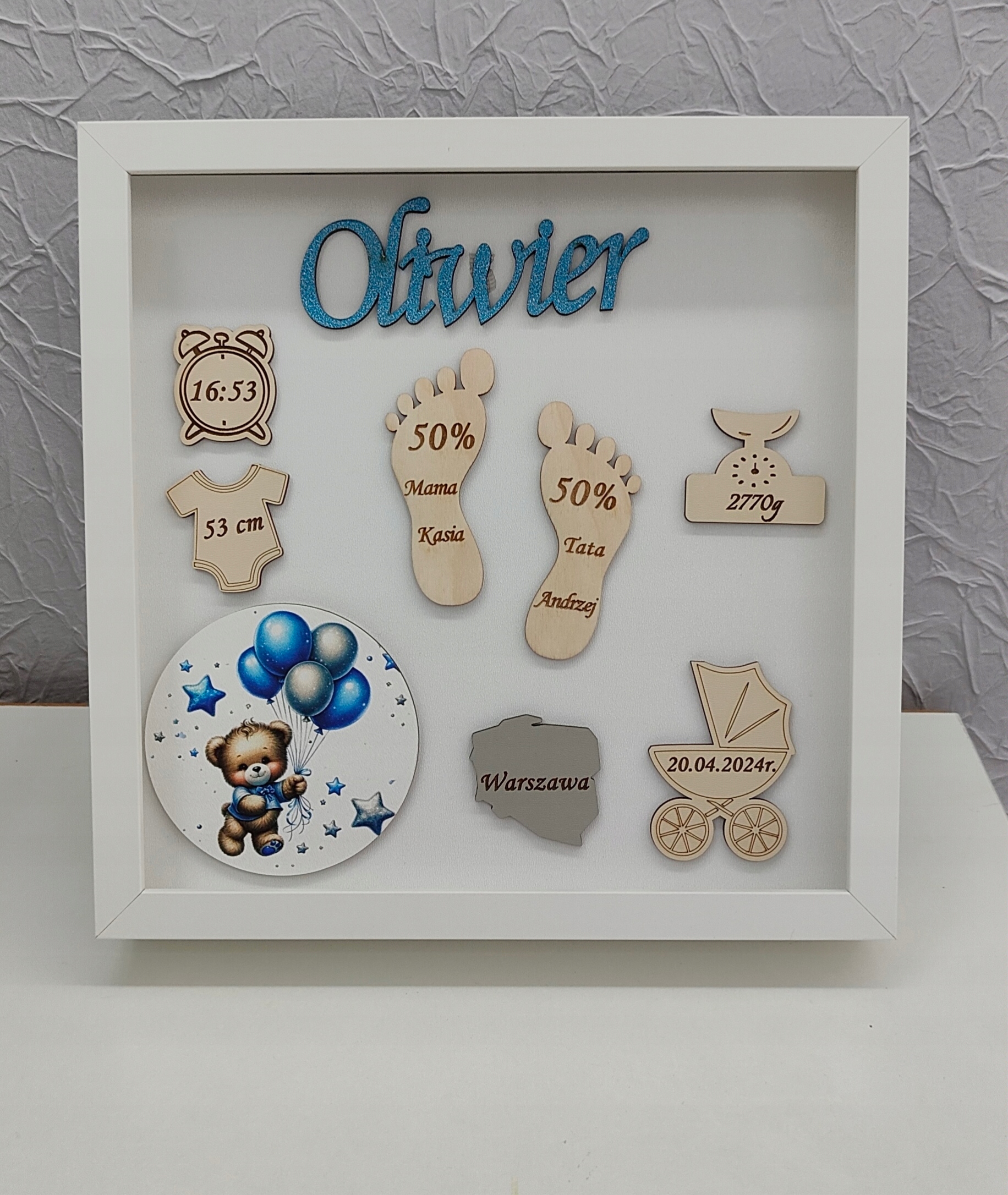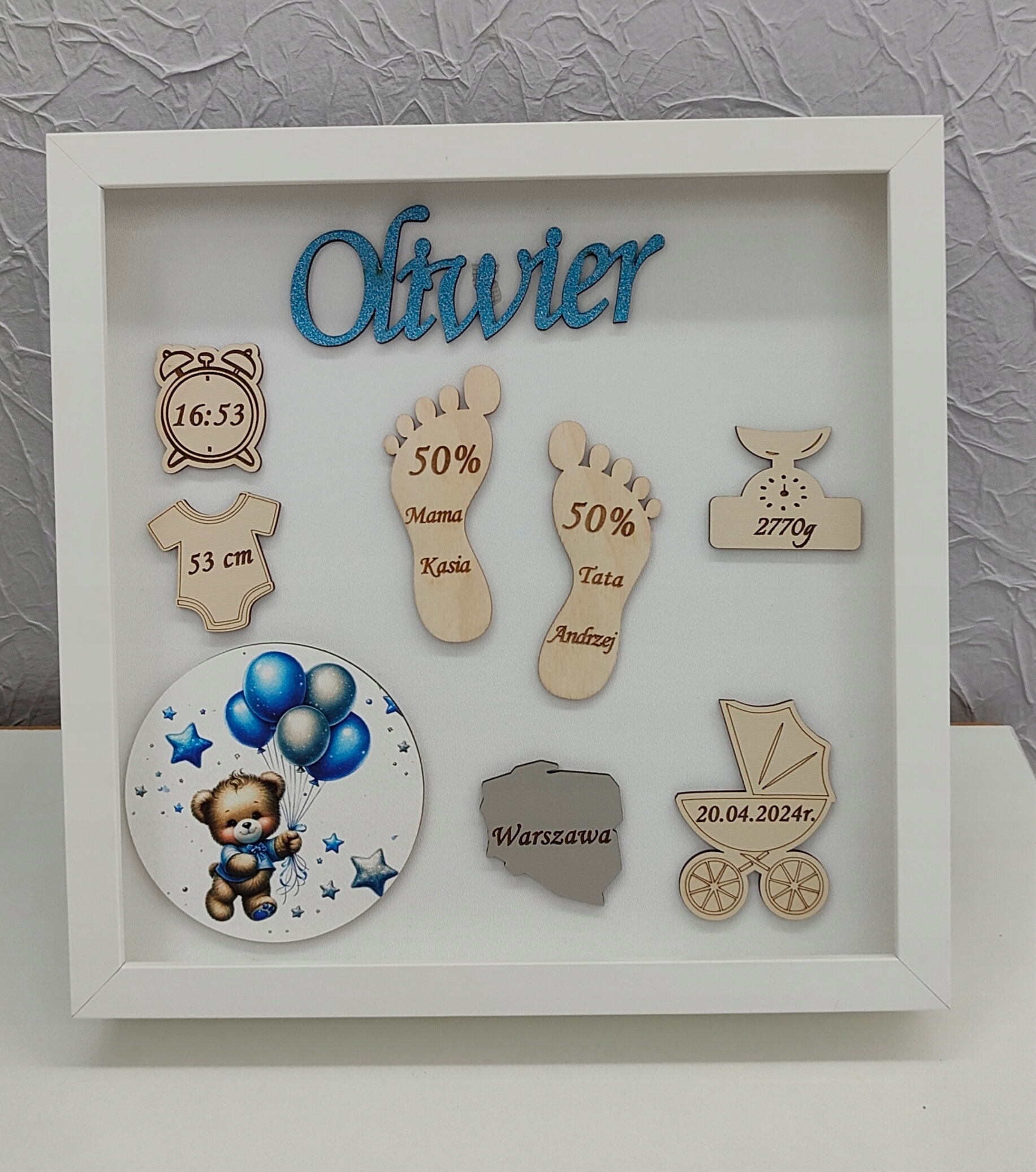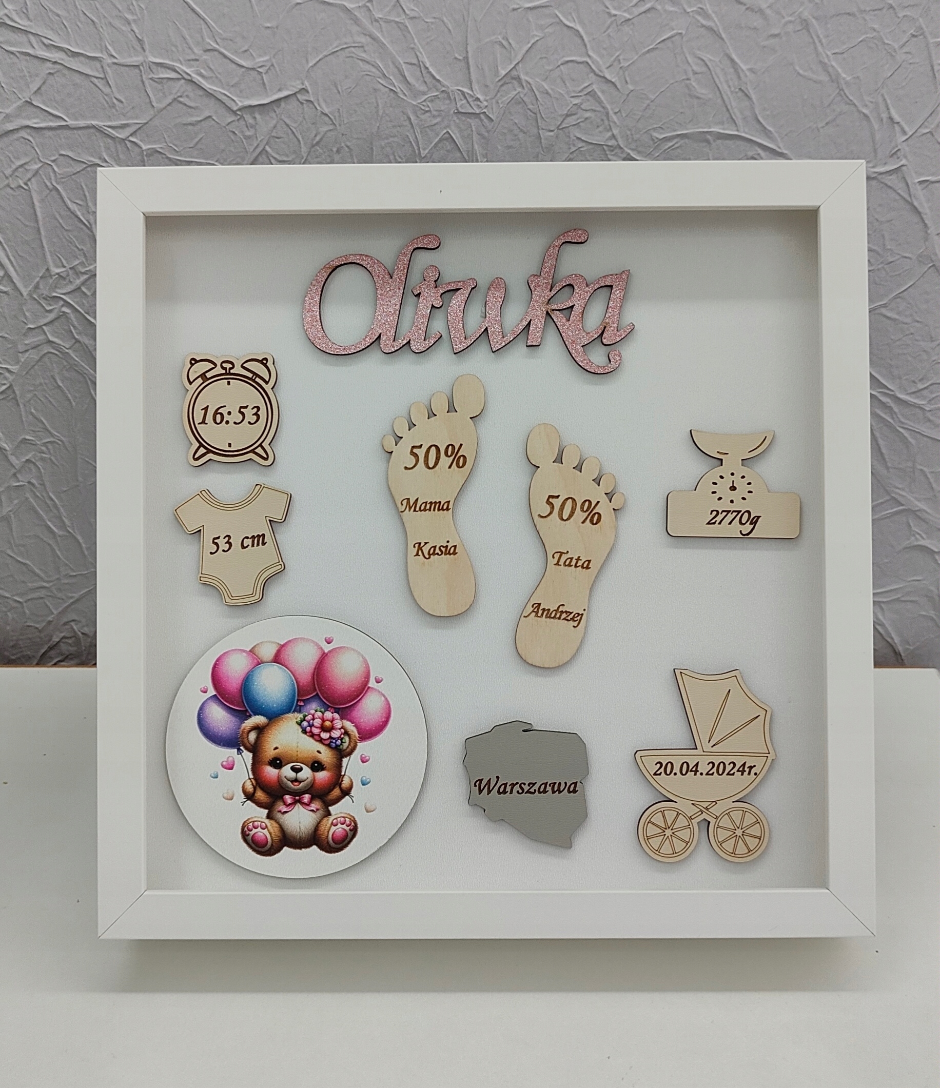 Рамка складається з комбінації кількох елементів - ультрафіолетового друку, HDF плити, фанери та блискучого імені малюка.