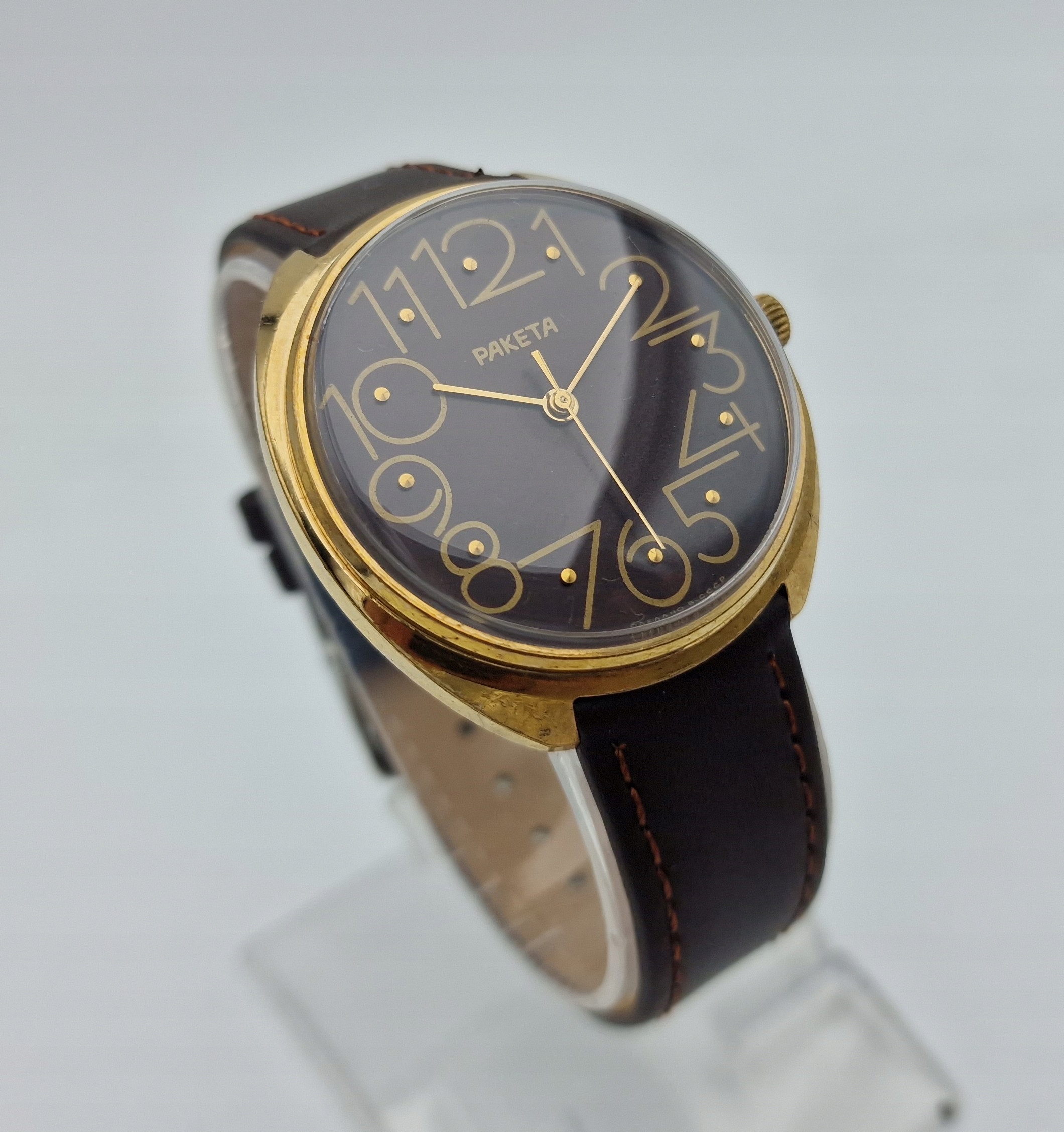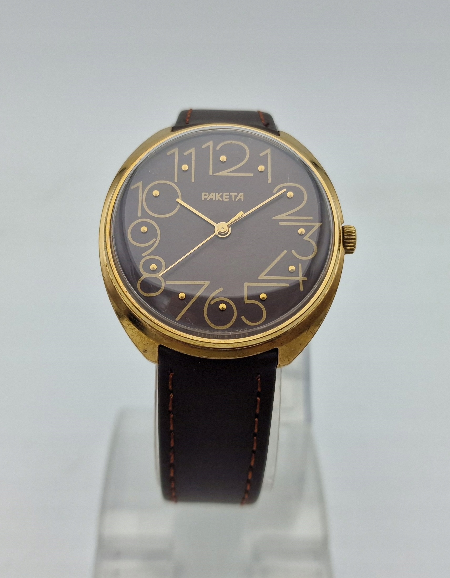 - Коричневий металевий циферблат із золотими цифрами. На щиті підпис: «РАКЕТА ЗРОБЛЕНО В CCCP». Циферблат майже в ідеальному стані, як показано на фотографіях.