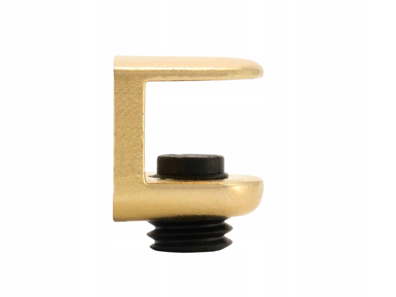 Металеве кріплення золотого кольору для скляної полиці. Ручка має вбудоване регулювання, що дозволяє захоплювати полиці різної товщини. Версія з отвором.