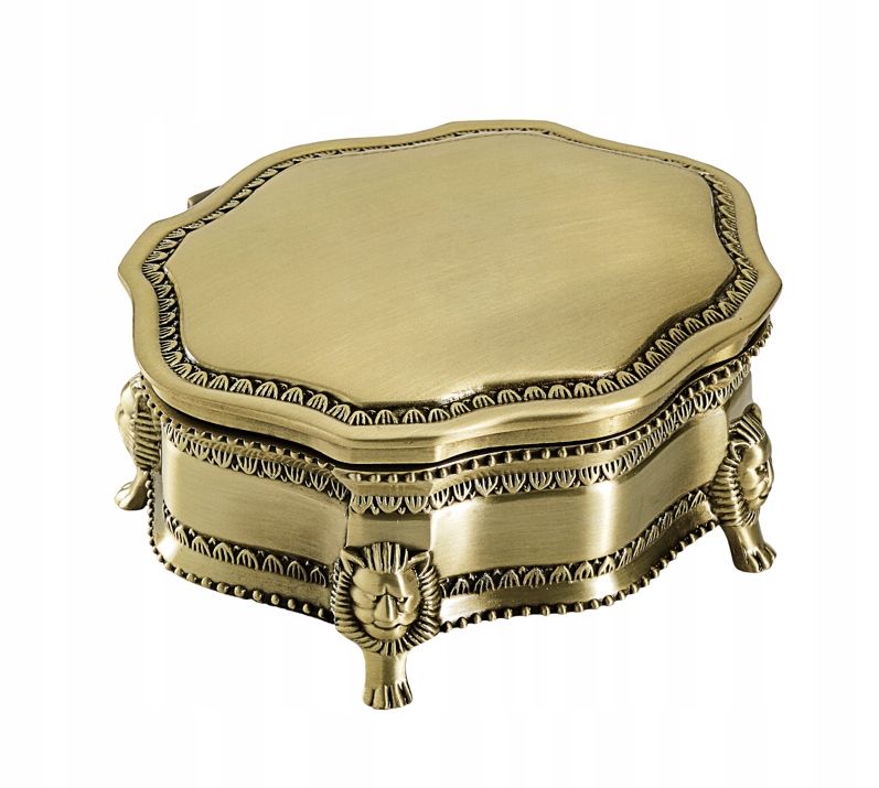 Захоплива скринька для прикрас. Виготовлений з плакованого металу кольору антична латунь. Він має унікальну неправильну форму та тонкі прикраси по краях. Він встановлений на чотирьох «лев’ячих» ніжках. Всередині є одне велике відділення для прикрас, обшите темно-синім матеріалом.