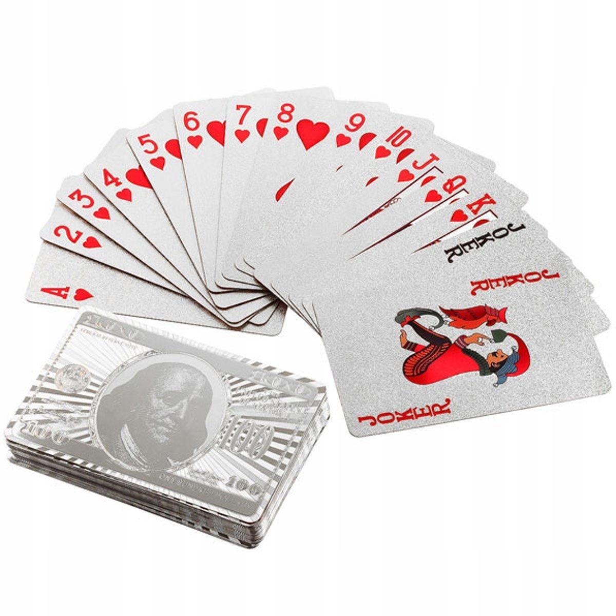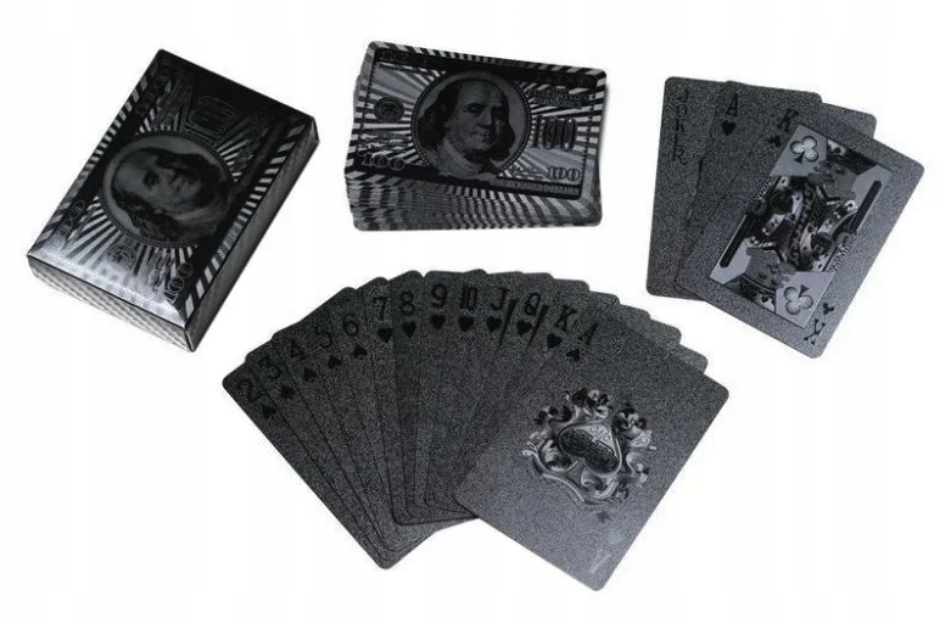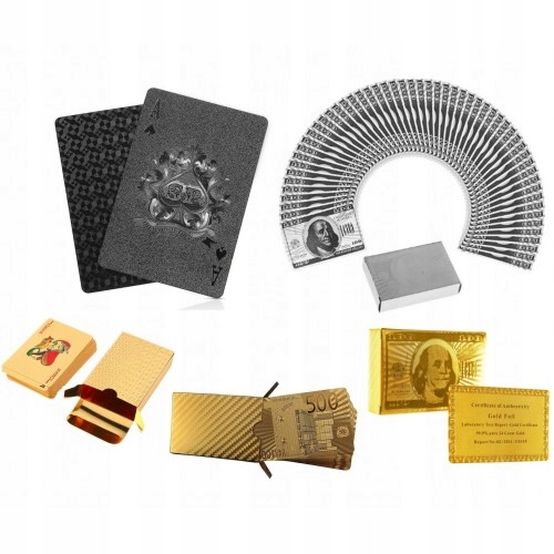 - Високоякісна колода сертифікованих карт, покритих фольгою з 24-каратним золотом