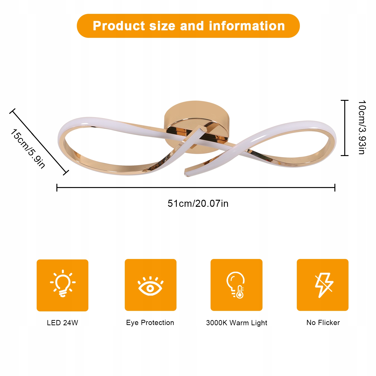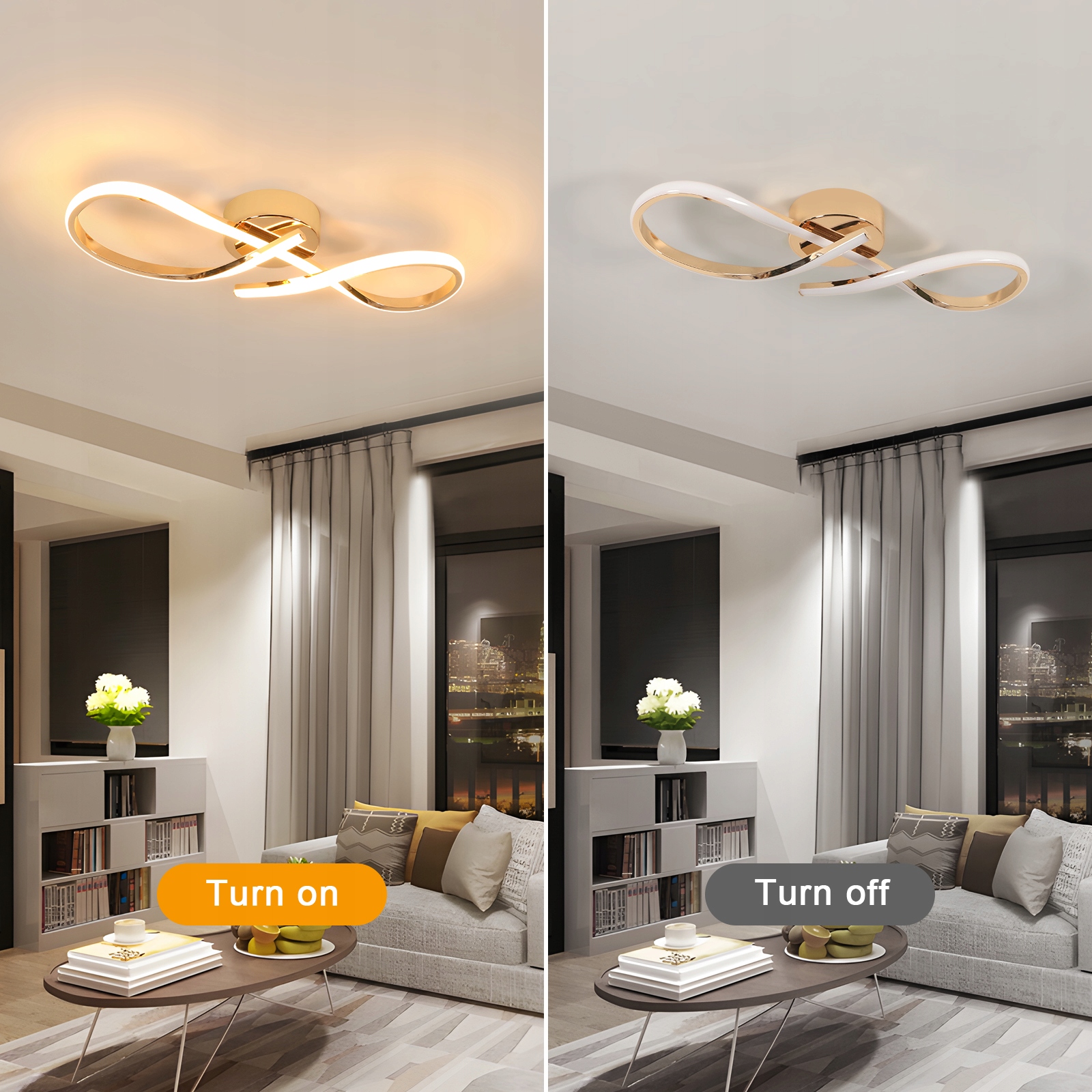 Світлодіодний стельовий світильник має вигнуті лінії та має елегантний і модний золотистий вигляд. Він простий і елегантний, не втрачаючи своєї індивідуальності, що робить його привертаючим увагу в будь-якій кімнаті.
