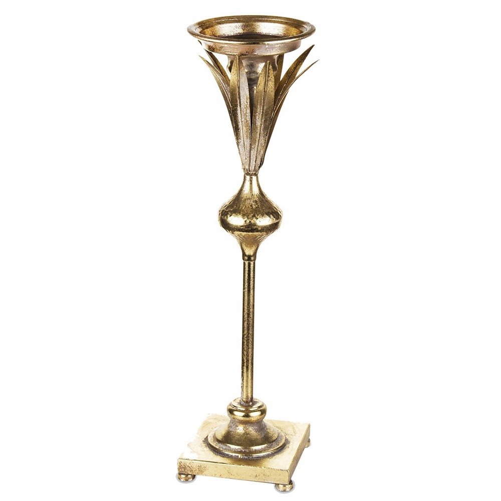 Золотий свічник на довгій ніжці, оповитий золотим листям. Виготовлений з металу, ідеально підходить для широких свічок. Добре підійде як елемент декору інтер'єру або як прикраса літньої тераси.