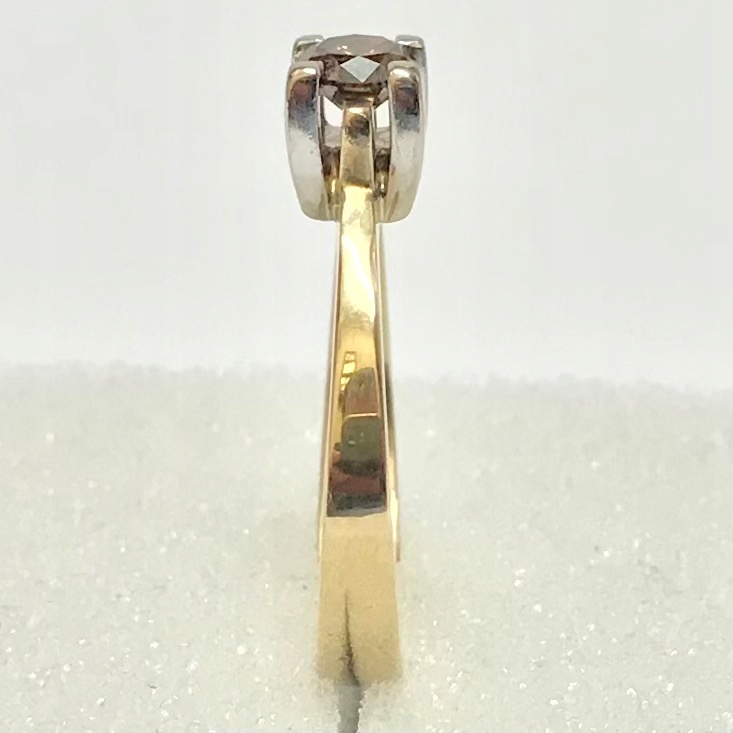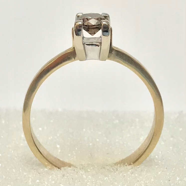 - Чудовий дизайн. Обручка з жовтого золота, прикрашена короною з білого золота з вбудованим красивим каменем - коричневим діамантом вагою 0,4 карата.