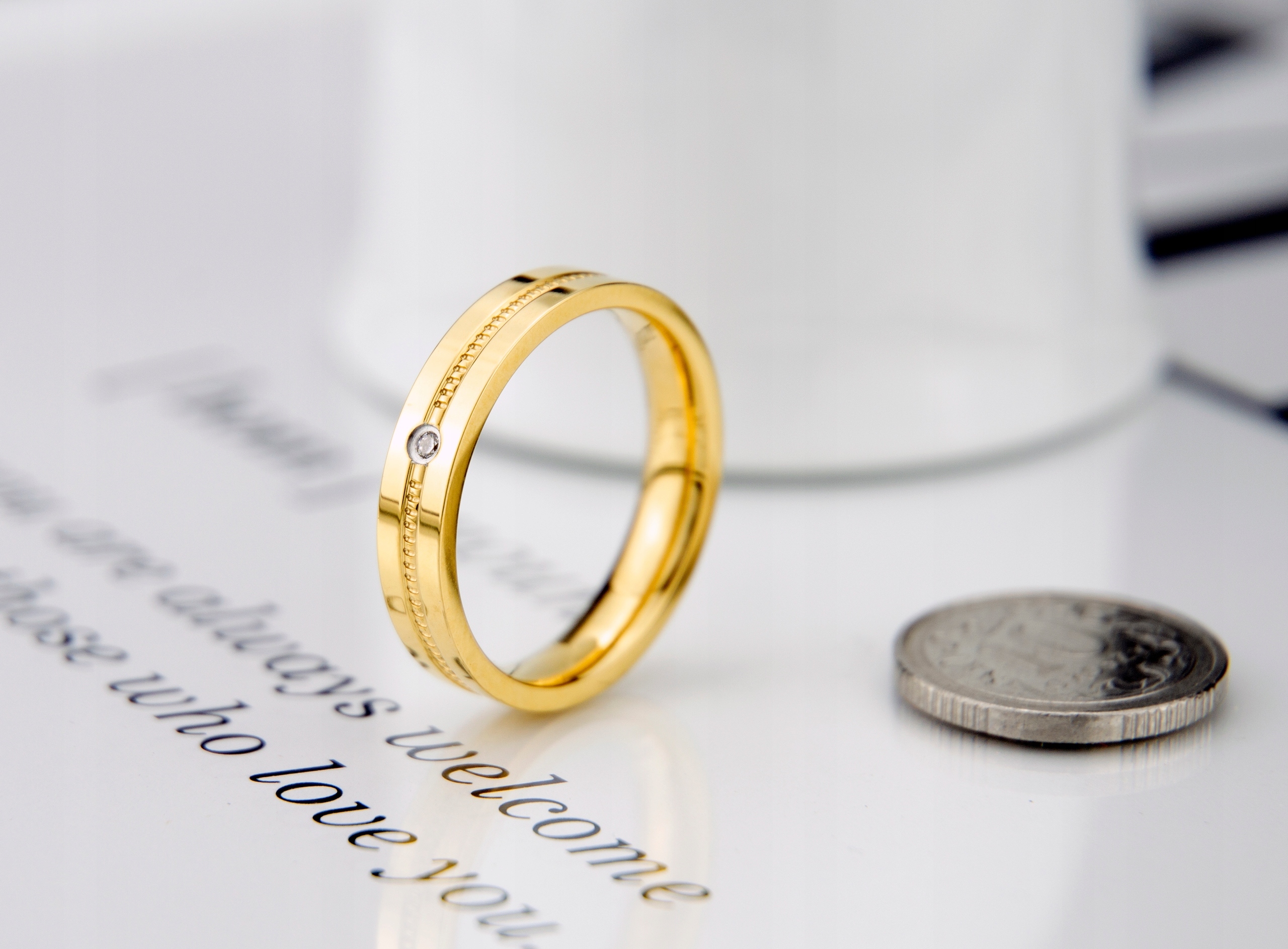 Обручка виготовлена з хірургічної сталі золотого кольору. Візуально його неможливо відрізнити від виробів із золота. Якість виконання, точність, глянець на найвищому рівні.