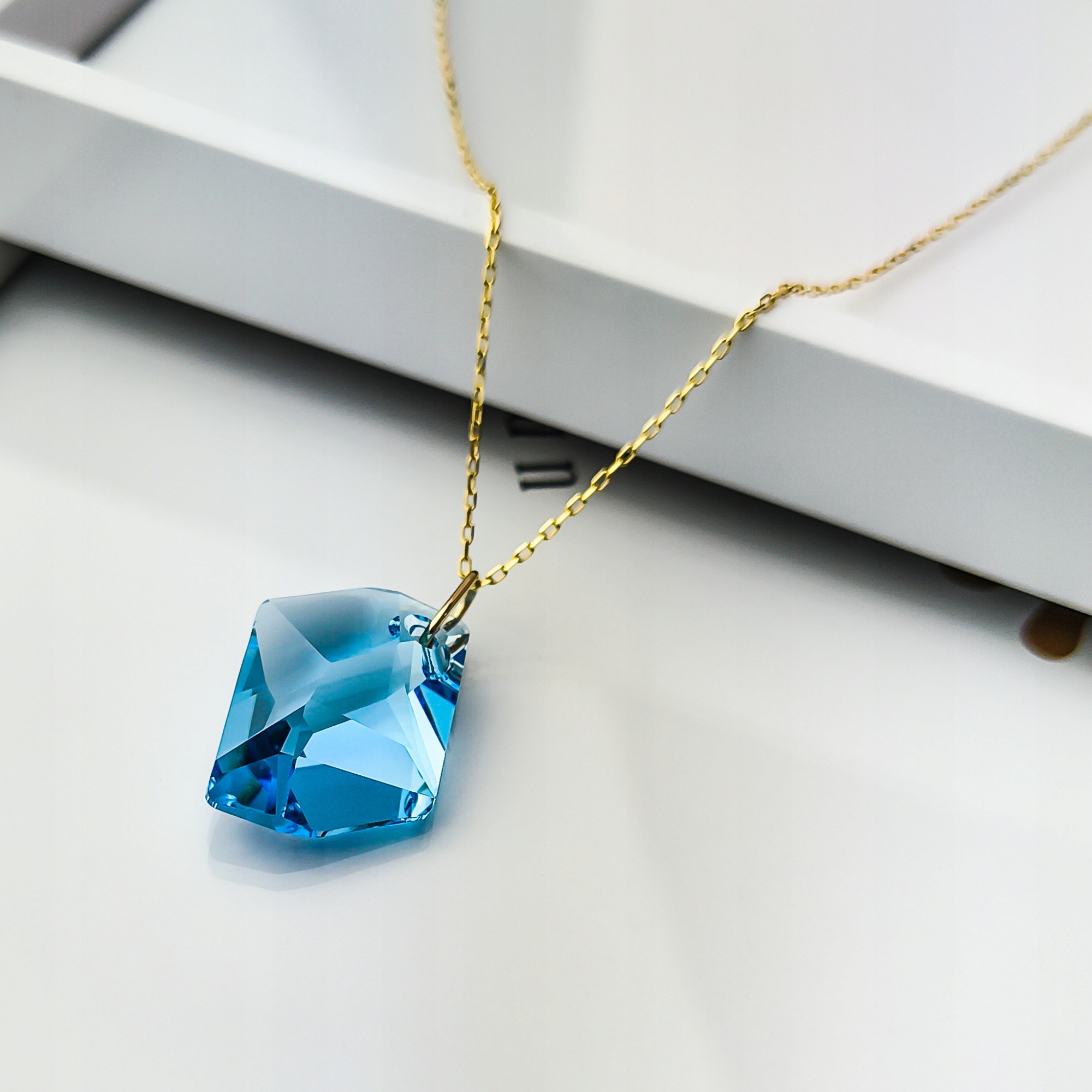 Відкрийте для себе чарівне сяйво та ефірну елегантність нашої золотої підвіски, прикрашеної сліпучим кристалом Swarovski® кольору, що нагадує темно-блакитний океан або чисте небо. Виготовлений із блискучого золота 585, цей кулон є ідеальним поєднанням благородного металу та ідеально обробленого каменю.