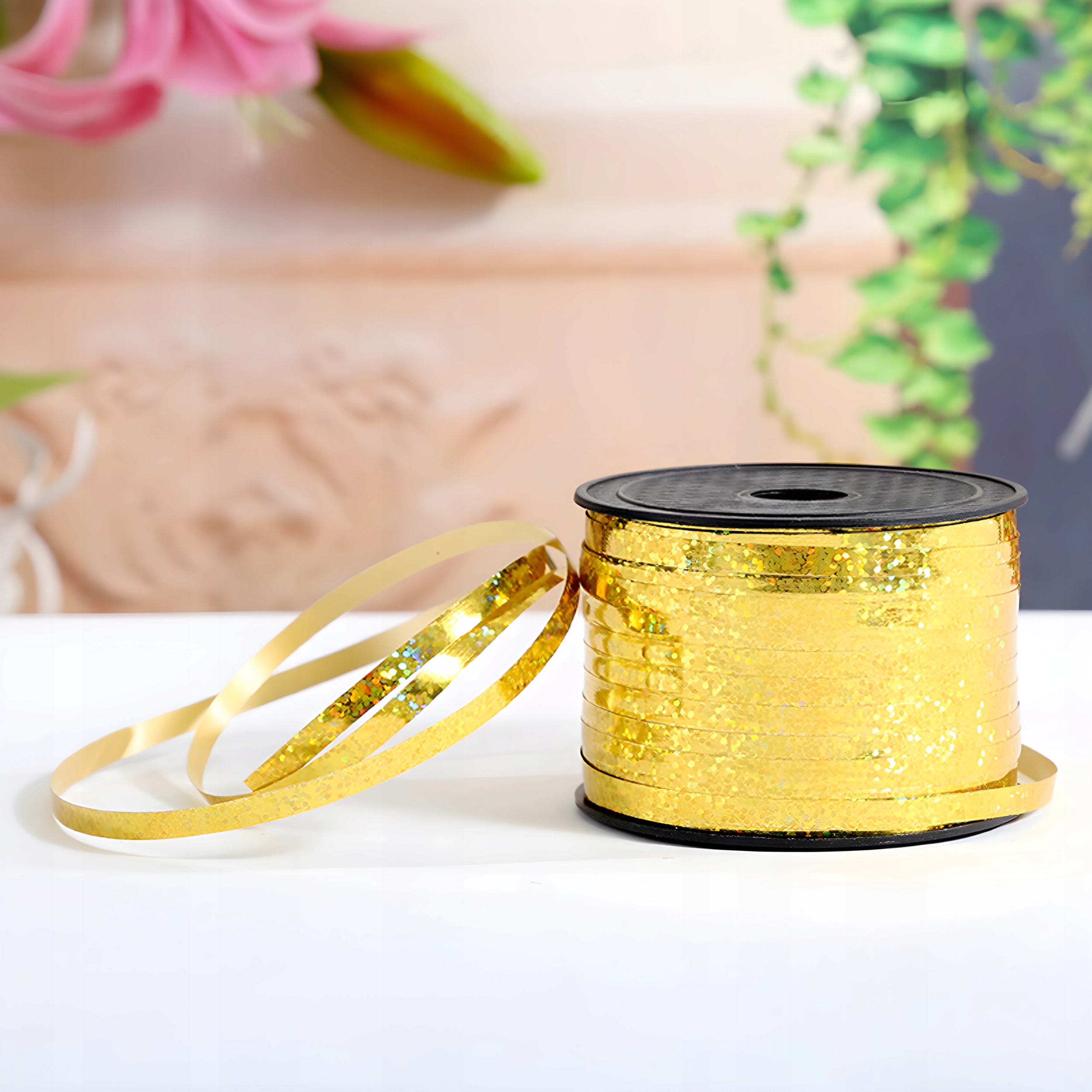Додайте трохи блиску кожного прикраси! Ця унікальна лазерна стрічка, покрита мерехтливими частинками, ідеально відображає світло, створюючи голографічний ефект. ідеально підходить для повітряних куль, подарунків для упаковки, букетів та висячих прикрас - стрічка, яка буде радувати в кожному розташуванні!
