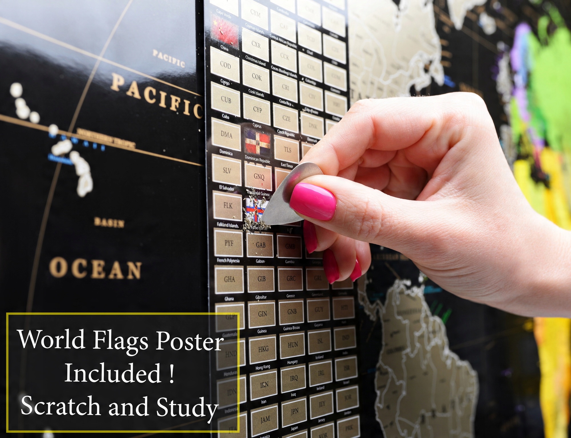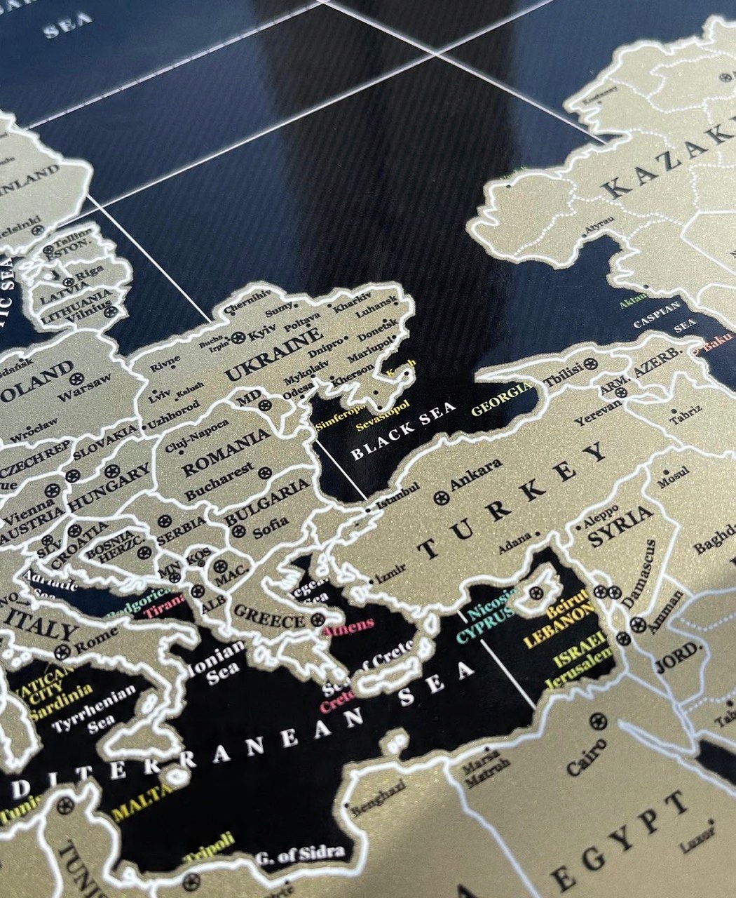 Велика ЧОРНО-ЗОЛОТА КАРТА XXL + ПЛАКАТ З ПРАПОРАМИ СВІТУ – ця чорно-золота скретч-карта виготовлена в Україні з високоякісних та екологічно чистих матеріалів, щоб створити розкішну та детальну скретч-картку для позначення вашої подорожі