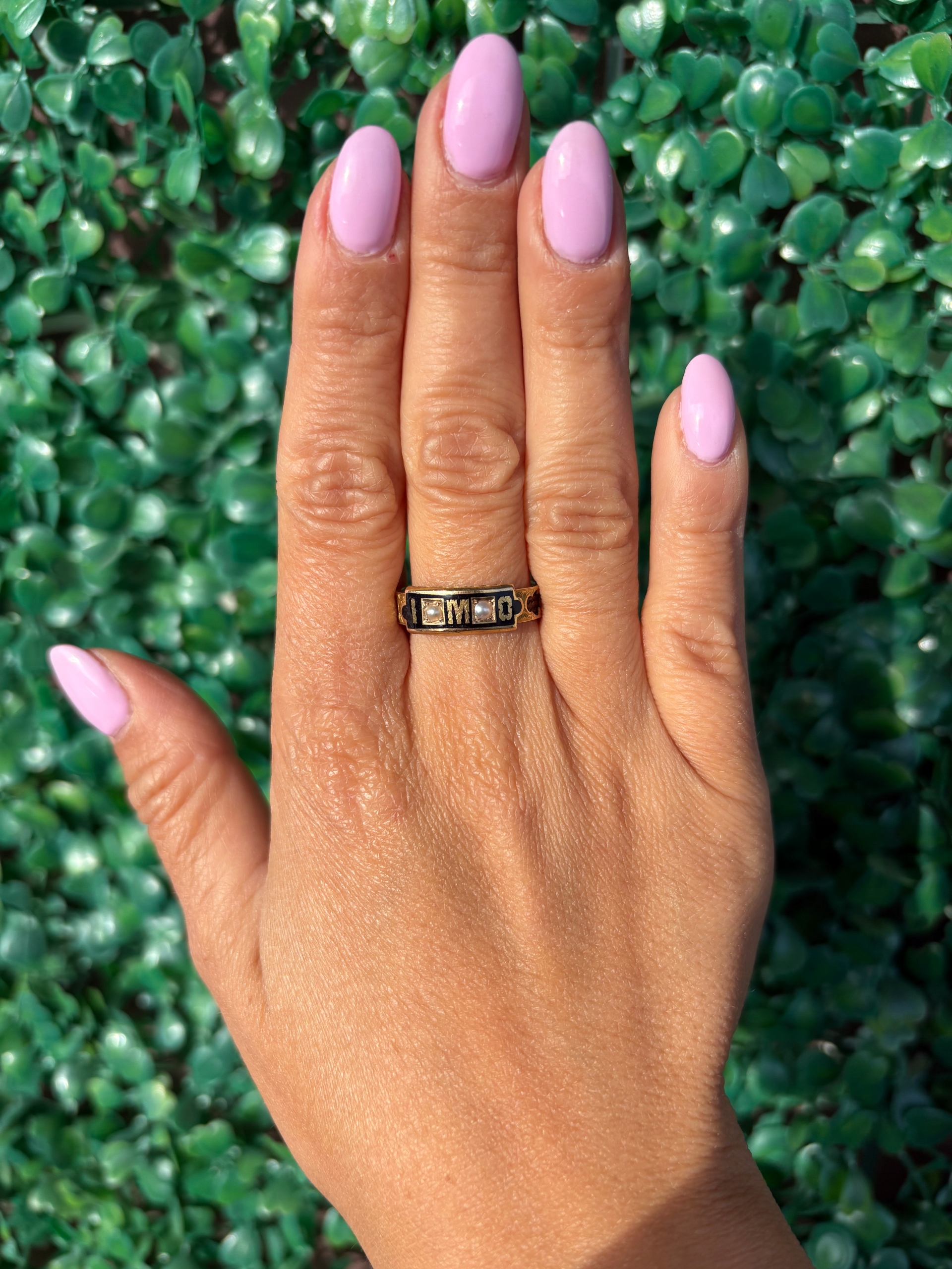Історичне похоронне кільце з кінця ХІХ століття, зроблене із золота з хитромудро гравірованими деталями та чорною емалі в техніці Тілла д'Епаргна. Листи "imo" (короткий для "на згадку про") були прикрашені невеликими перлами - символом сліз і чистоти. Кільце - прекрасний приклад сентиментальних ювелірних виробів вікторіанської епохи, створеної на згадку про улюблених людей. Зворушливий сувенір і в той же час унікальний колектор з високою історичною цінністю.