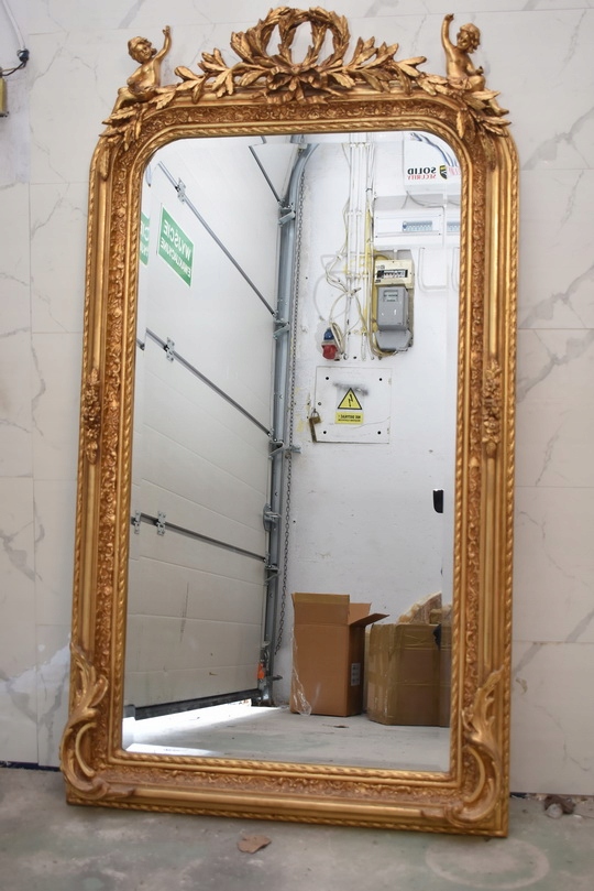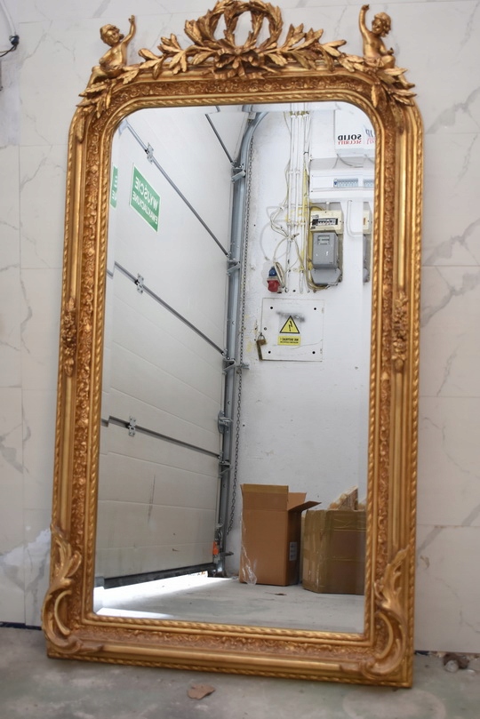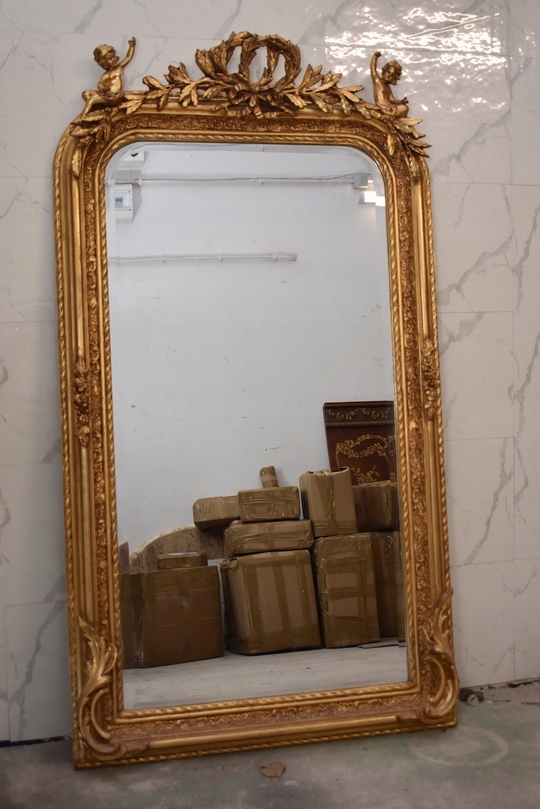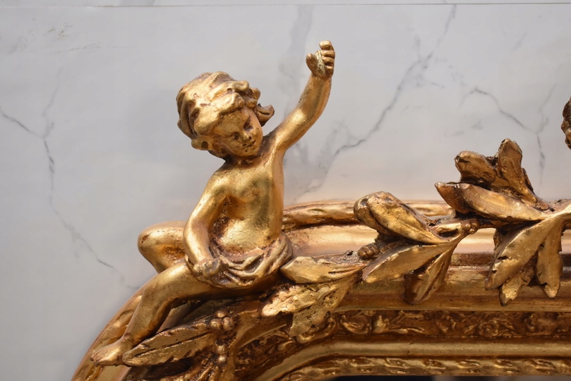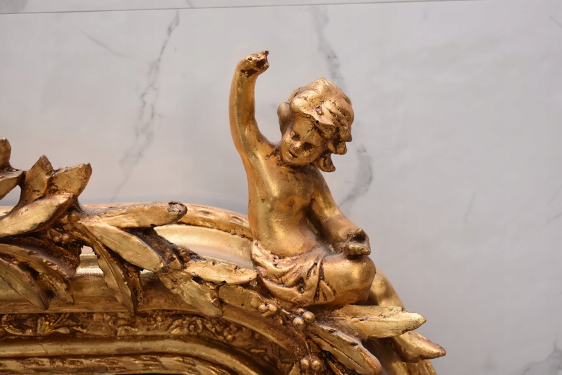Елегантне кришталеве дзеркало із золота з ефектною позолоченою рамою, щедро прикрашене палацовими мотивами. У верхній частині є декоративний медальйон із двома купідонами (янголами), що надає всьому унікальний, класичний характер.
