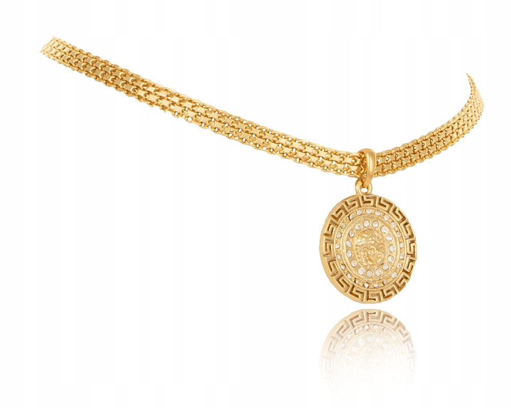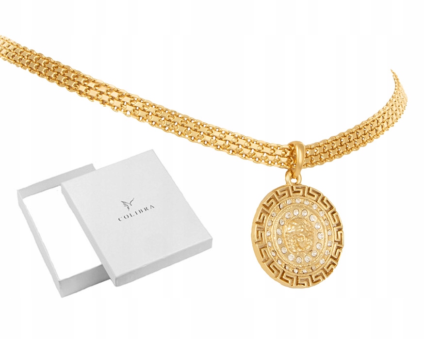 Золотий, привабливий кольє/намисто/намисто з товстого ланцюжка з підвіскою у формі великої грецької монети, з ювелірного сплаву, постійно позолоченого 24-каратне золото, відповідно до найвищих стандартів ювелірного мистецтва та уваги до деталей, має оригінальні бірки компанії.