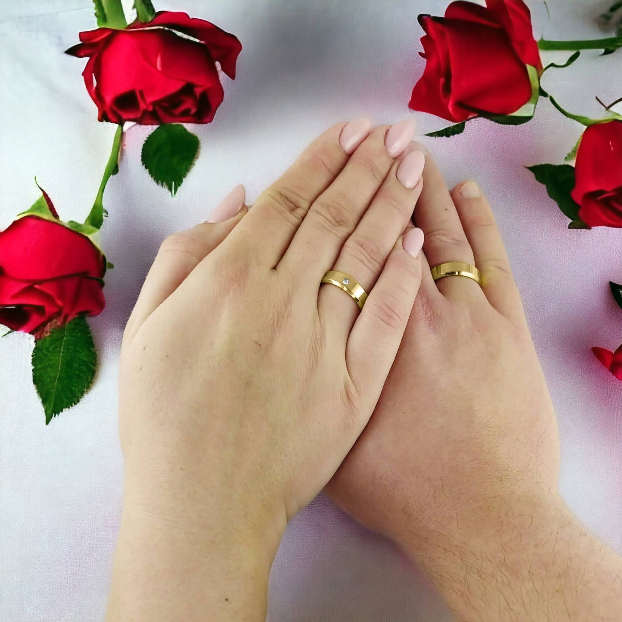 Жіноча обручка KO4 прикрашена тонким цирконом, який додає блиск і ніжний шарм. Однак чоловіча обручка залишається надзвичайно класичною та мінімалістичною, ідеально поєднуючись із чоловічим стилем.