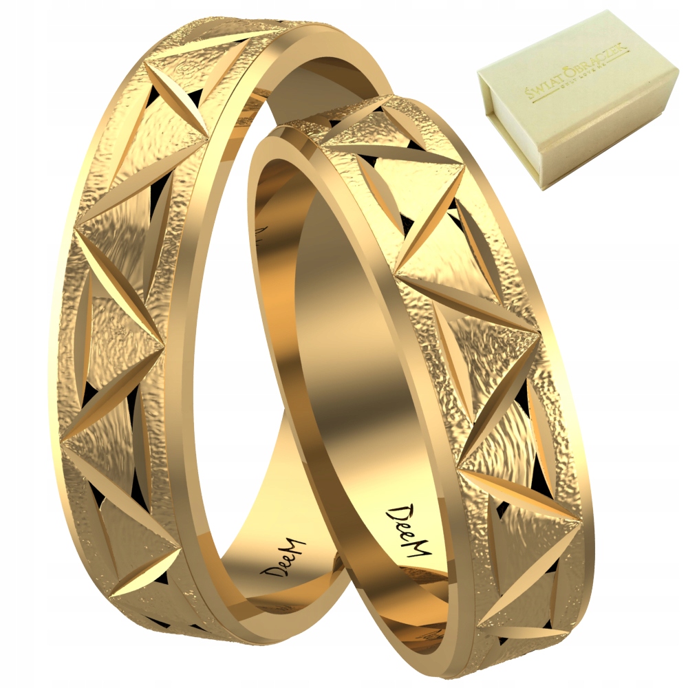 Обручки виготовлені зі срібла 925 проби найвищої проби, покриті 23-каратним золотом, що робить їх схожими на обручки, зроблені повністю із золота. Позолота становить 2 мкм і додатково захищена безбарвним захисним шаром. Такий спосіб виготовлення забезпечує високу міцність. Матова поверхня обручок прикрашена діагональними діамантовими огранюваннями. Сліпуче блискучий малюнок чудово підкреслює чарівність атласного фону. Купуючи цей набір, ви можете бути впевнені у високій якості, яка поєднується з дуже привабливою ціною.