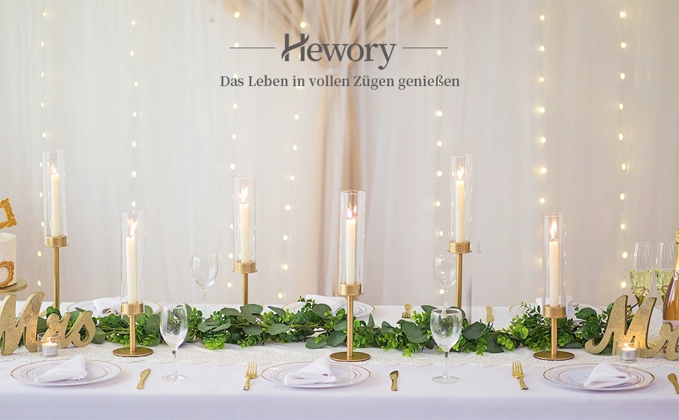 Hewory Sicnlestick у старовинному стилі складається з металевого золотого свічники та демонтажу ураганських скляних свічників. Високоякісна металева основа завантажується, щоб запобігти перепаді. Естетичний прозорий свічник чудово підходить для використання у свіжому повітрі, оскільки скло захищає від полум'я.