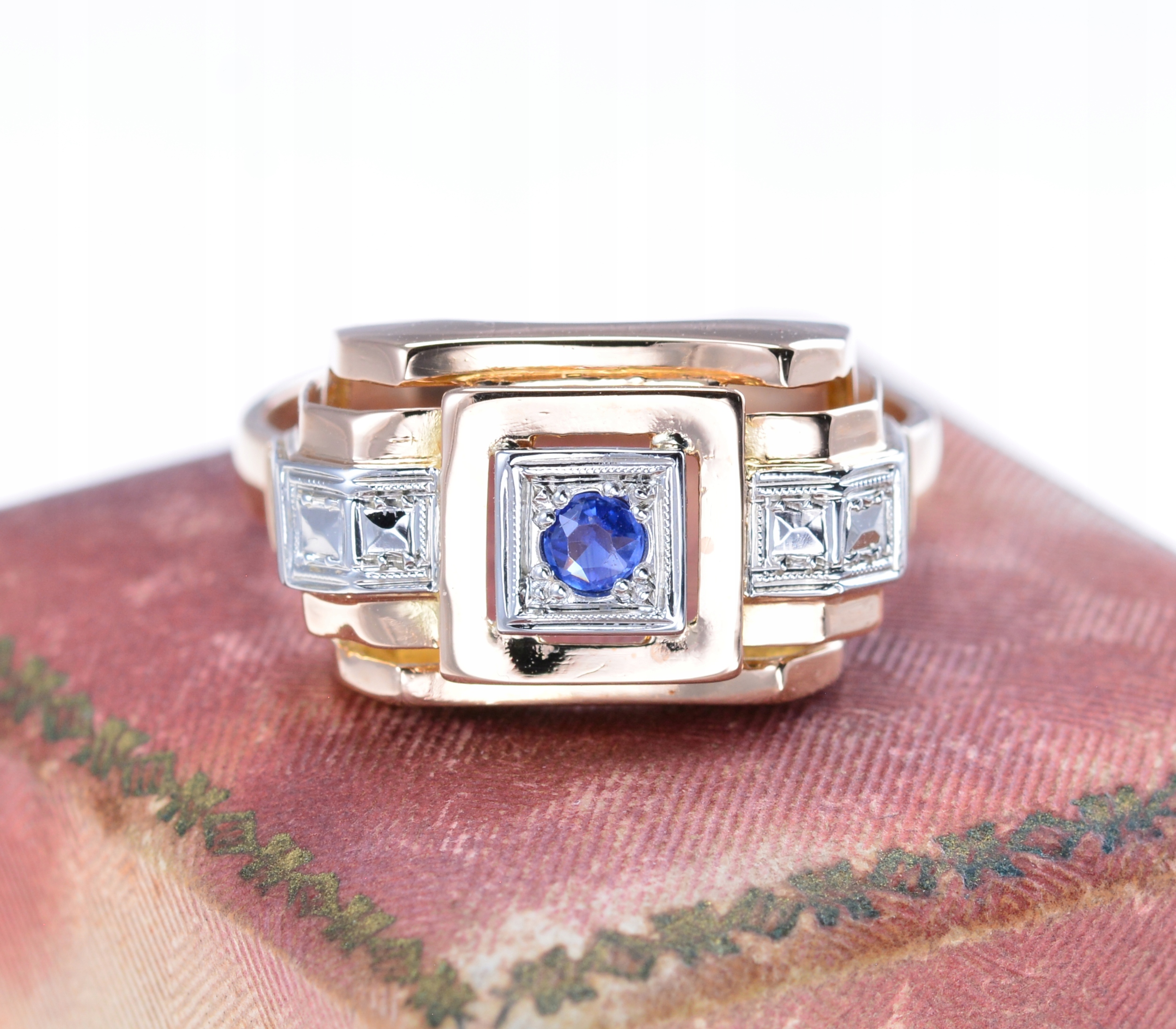 - Вироблено з 18-каратного золота. Основна точка композиції - це круглий синій сапфір (0,11ct), вбудований у квадратний обстановка. Сторони кільця прикрашені симетрично розташованими прямокутними елементами, що утворюють каскадну структуру, характерну для періоду арт -деко.