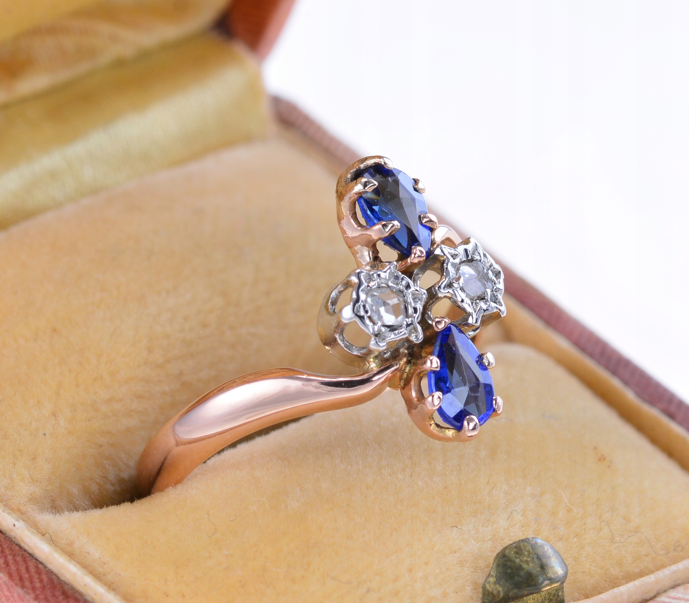 - Золотий випробування 750, прикрашений двома скляними імітаціями сапфірів та двох ділогазів у рорі.