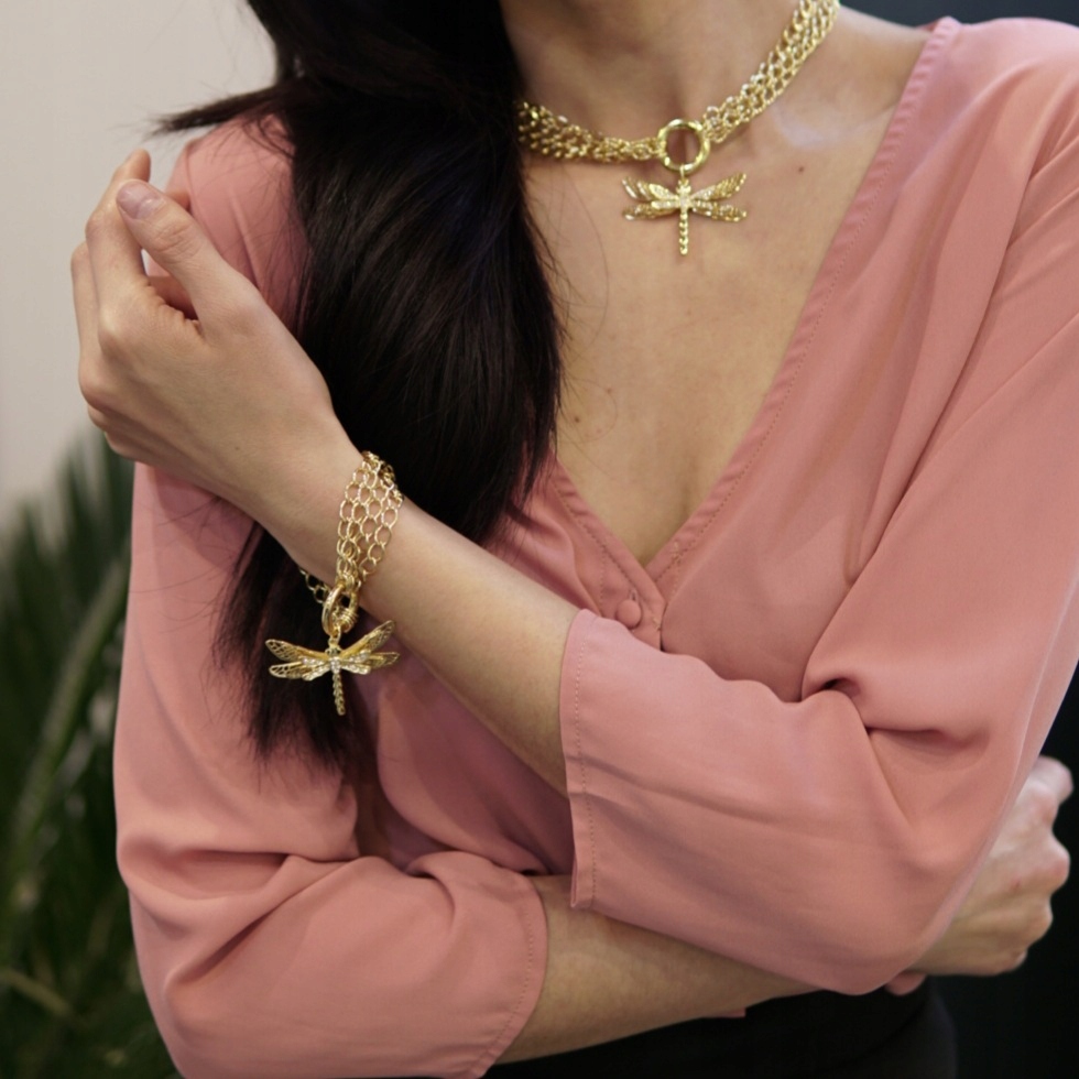 Золотий браслет із бабкою, від Colibra, вручну прикрашений кристалами Swarovski, виготовлений із ювелірного сплаву, постійно позолоченого 24-каратним золотом, відповідно до найвищих стандартів ювелірного мистецтва та уваги до деталей, мати оригінальні ярлики компанії.