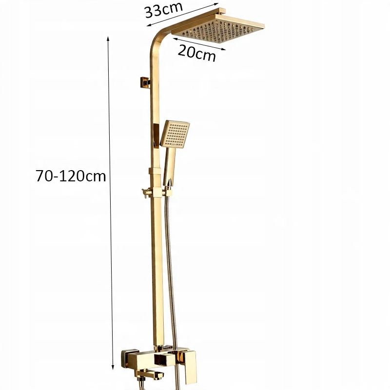 Золотий накладний душовий набір із тропічним душем Накладний душовий гарнітур з тропічним душем елегантного золотистого кольору - це поєднання сучасного дизайну та розширеної функціональності. Дощовий душ робить душ розкішним досвідом, а регулювання потоку води регулює інтенсивність відповідно до індивідуальних уподобань користувача. Легкий монтаж у навісну систему гарантує естетичний вигляд ванної кімнати, а міцна конструкція та високоякісні матеріали забезпечують довговічність комплекту. Цей душовий набір є не тільки практичним рішенням, але й стильним елементом, який надає ванній кімнаті сучасний характер, створюючи ідеальне місце для відпочинку та відпочинку.