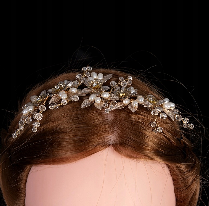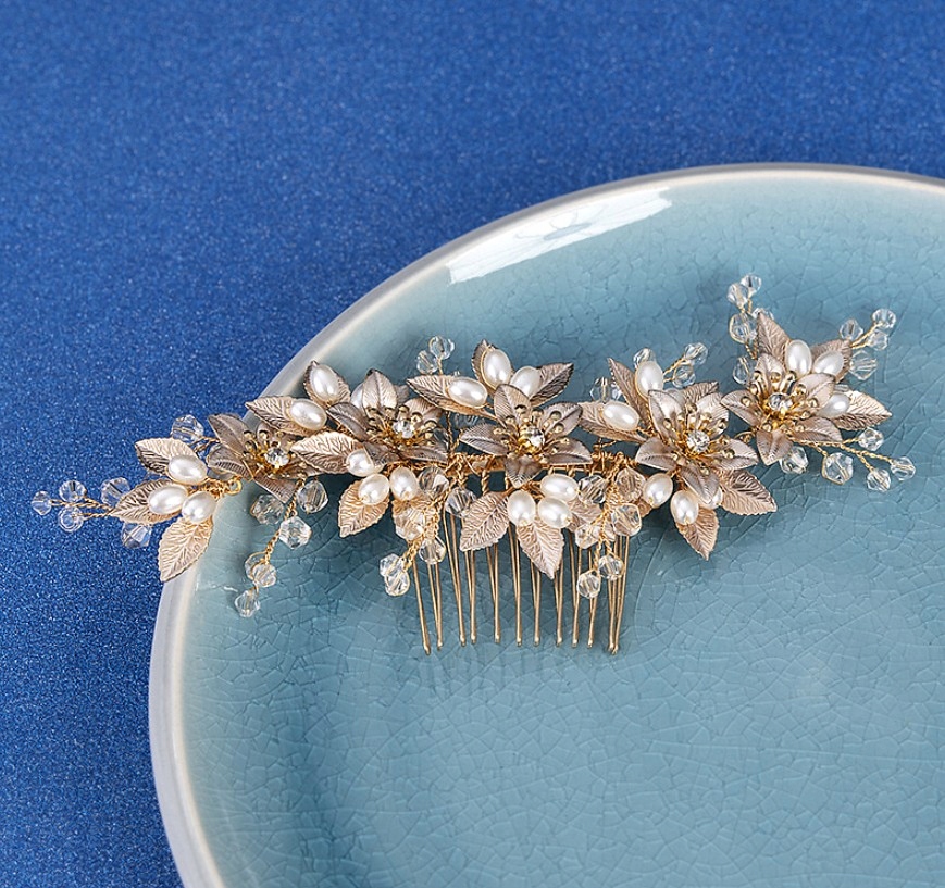 ✅ Гребінець виготовлений з високоякісних дротів золотистого кольору, прикрашений прозорими кристалами, білими перлами та гарними добротними квітами.