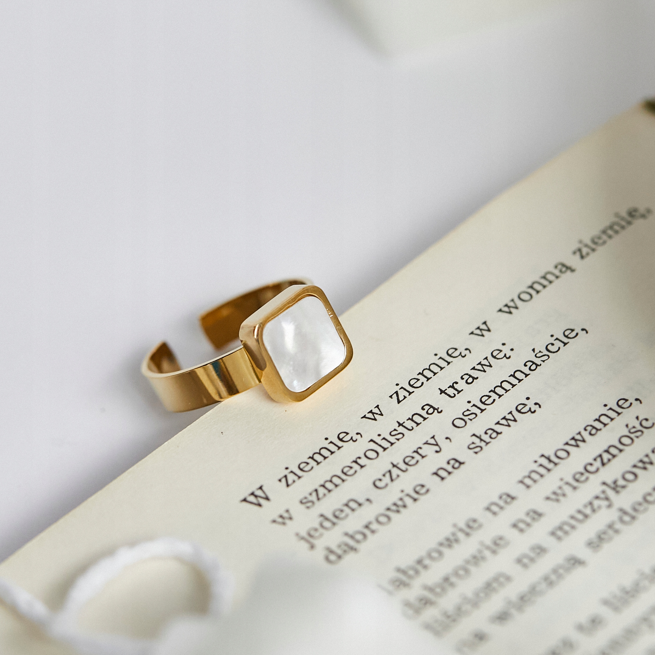 Ніжна золота каблучка з хірургічної сталі, покрита золотом 18 карат з білим перламутром