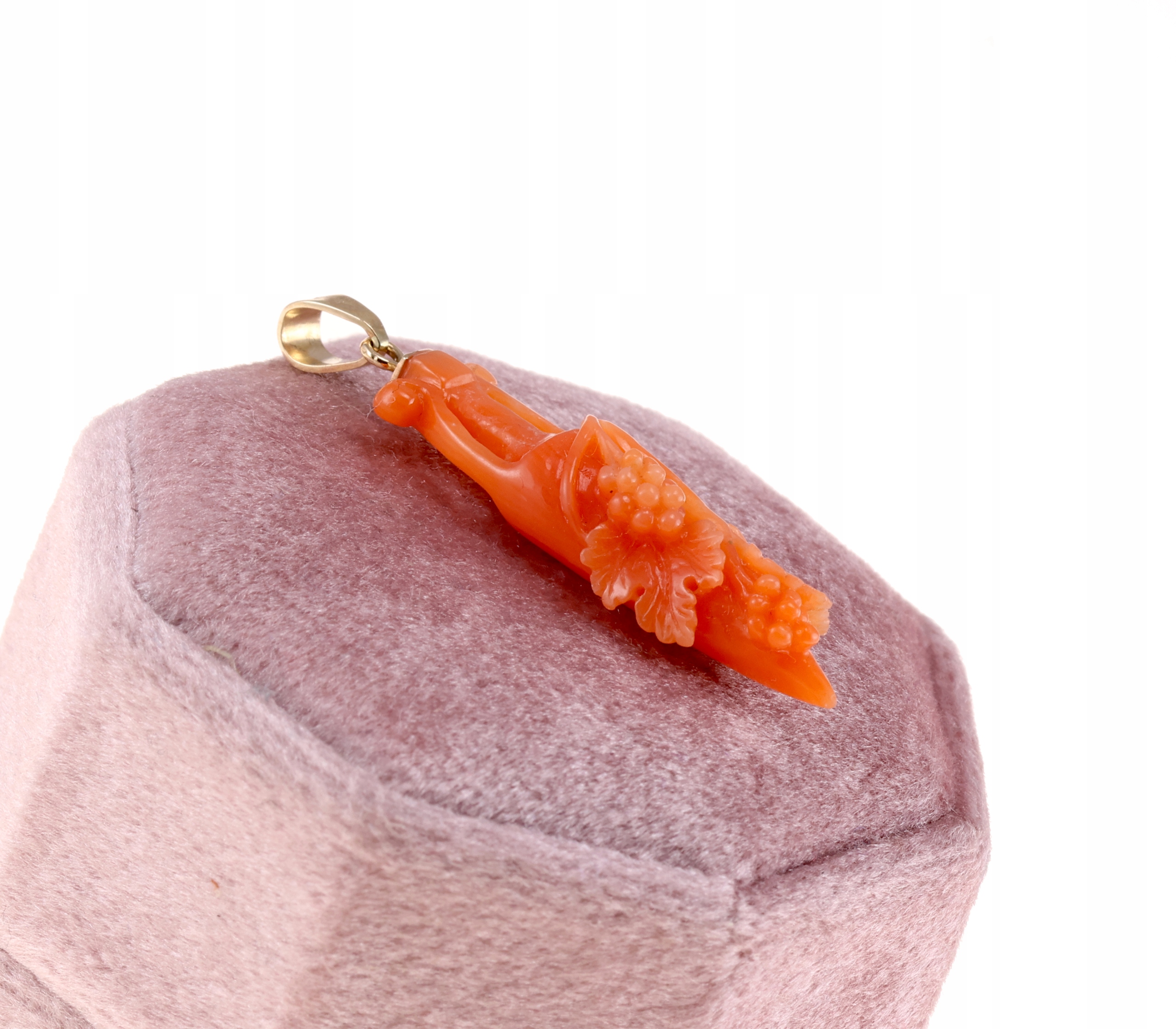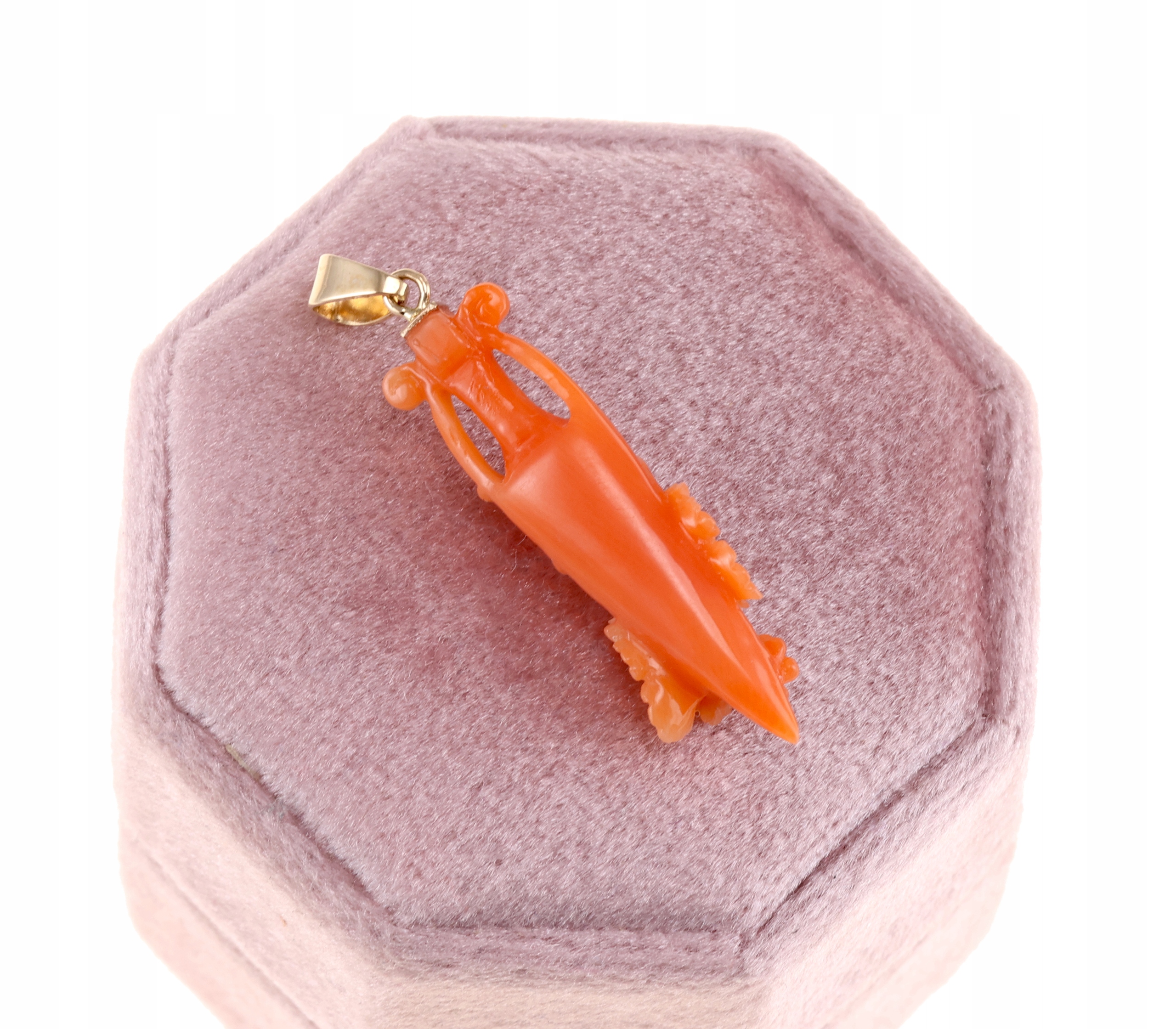 Предмет продажу - кулон з натуральних коралів форми натхненний античною амфорою, з характерною ажурною верхньою частиною та багатим декором виноградної лози. Різьблена деталь свідчить про традиційну італійську майстерність виготовлення коралів початку 20-го століття. Золотий кулон 585 проби завершує композицію, його можна носити на будь-якому ланцюжку.