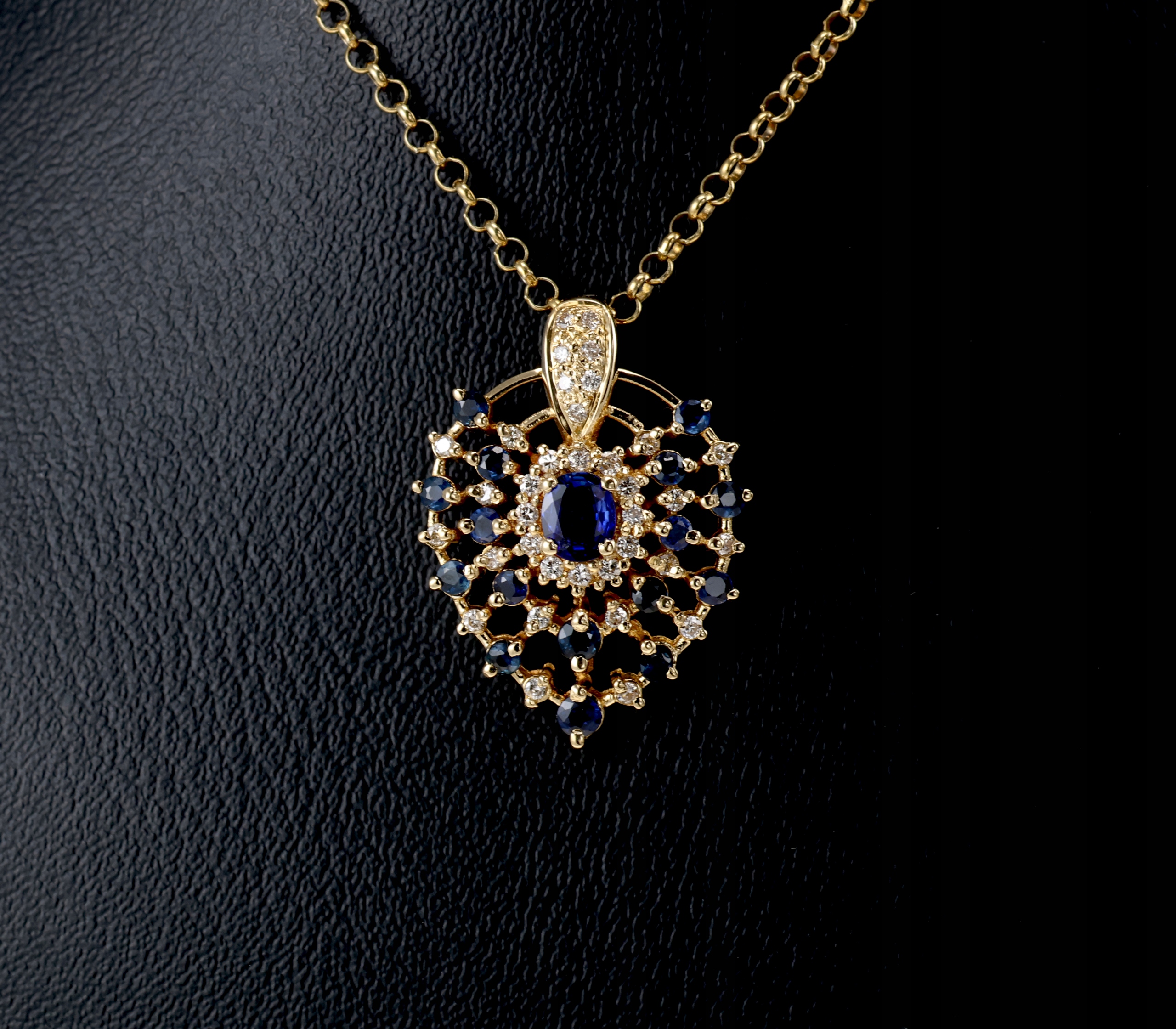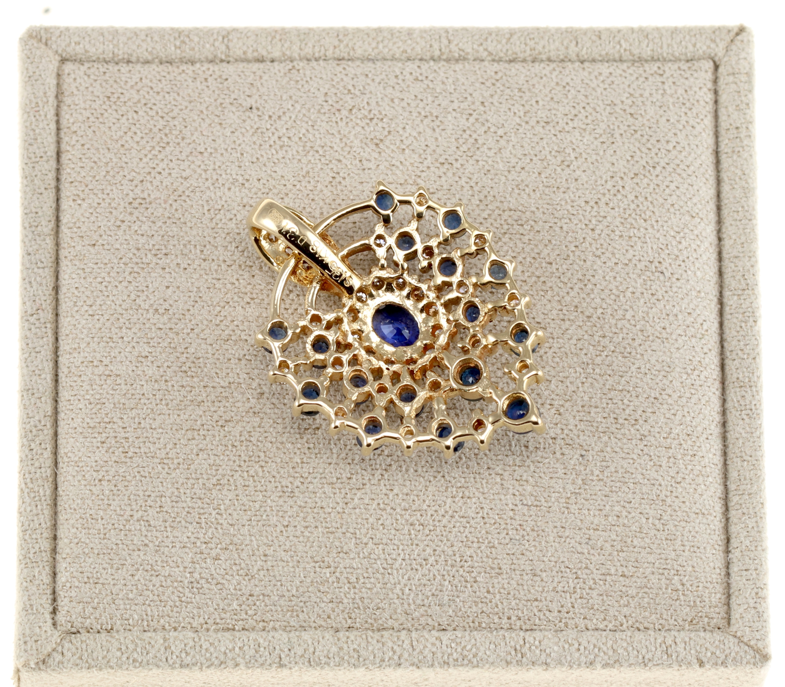 Предмет продажу - кулон вищої якості золото 750 проби, прикрашене центральним сапфіром, оточеним дрібними діамантами та додатковими сапфірами. Композиція має форму розетки з ажурною структурою. Загальна вага діамантів 0,31 карата, сапфірів 1,09 карата.