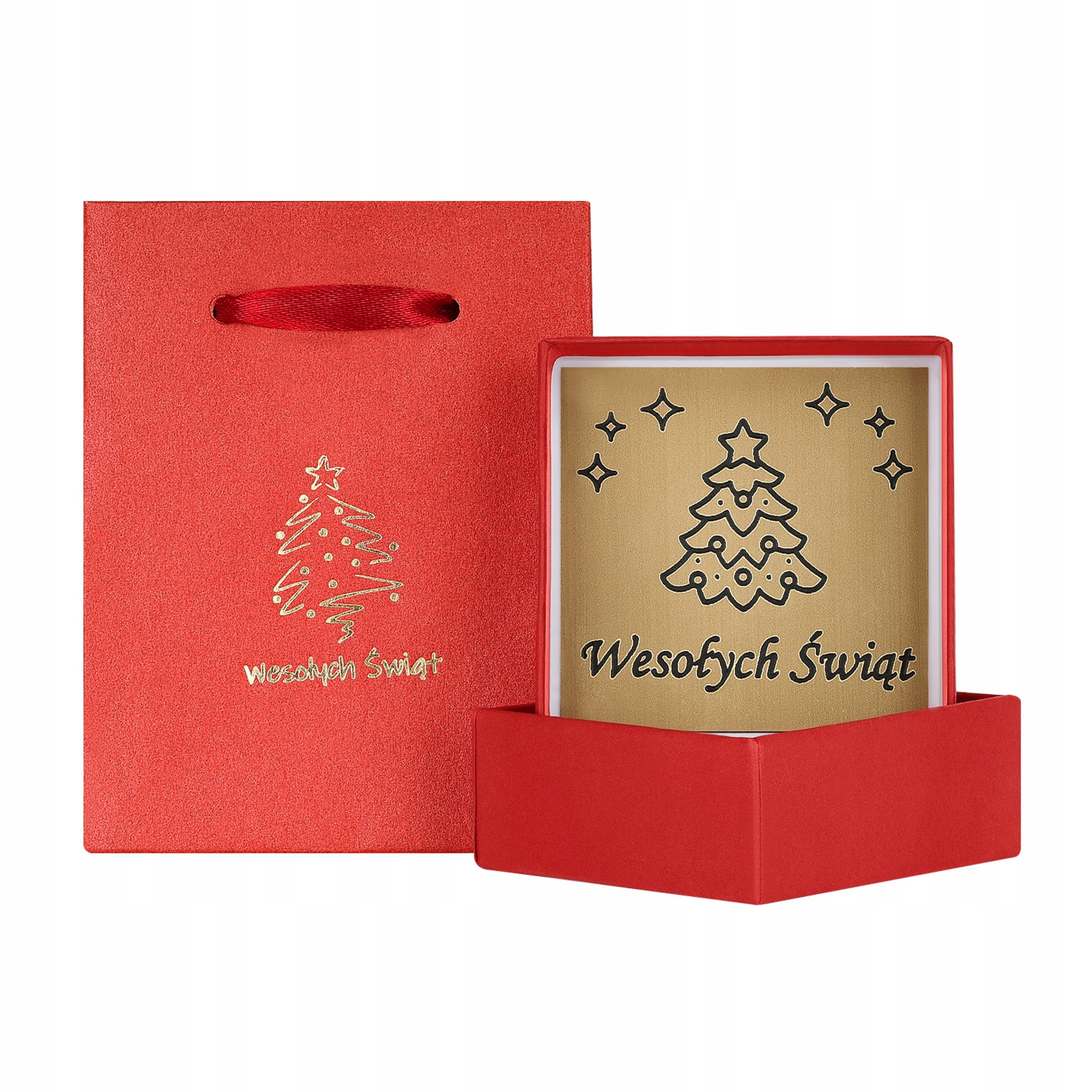 - Червоний подарунковий мішок з тонким золотим друком із зображенням ялинки та написом "Веселого Різдва". Сумка виготовлена з високоякісного паперу з невеликим блиском, що надає йому унікального характеру. Завершено суцільними, червоними ручками, забезпечує зручність перенесення. Коробка прикрашена тим самим різдвяним мотивом, який створює цілісний та естетичний вигляд набору.