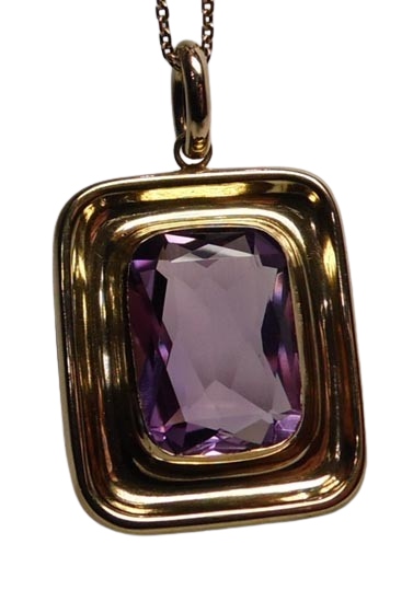 ЗОЛОТИЙ КУЛОН АРТ-ДЕКО, НАТУРАЛЬНИЙ АМЕТИСТ. Підвіска ручної роботи із золота 0,333-8 карат. Вага 5600 г. Розміри прикраси/рами 2,37 х 2,86 сантиметра. «Висота» 6,4 мм. Загальна довжина з підвісною ручкою 3,87 см. Натуральний аметист 1,31 х 1,85 см. Ювелірні вироби 1920-1940 рр. виробництва. Винятковий стан збереження.