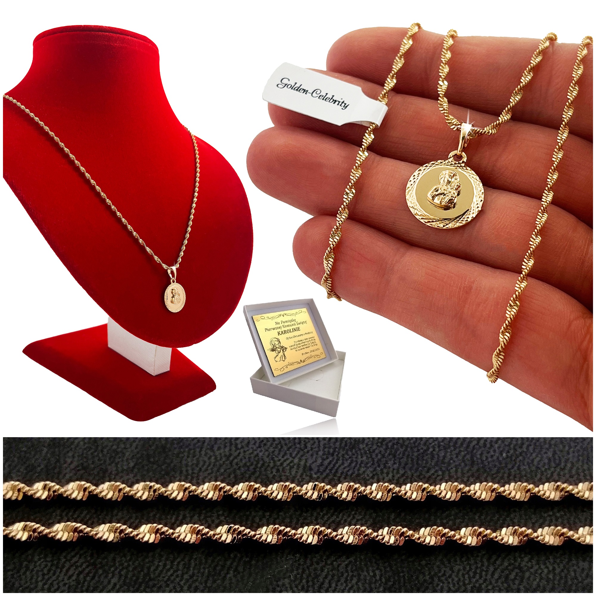 ЗОЛОТИЙ ЛАНЦЮЖОК І МЕДАЛЬ ДЛЯ ПРИЧАСТЯ ЧЕНСТОХОВСЬКОЇ БОГОРОДИЦІ 18K + ГРАВІЮВАННЯ