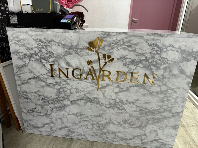 Золотий логотип на стіні, логотип оргскла під лічильником, золоте дзеркало з оргскла, 3D логотип