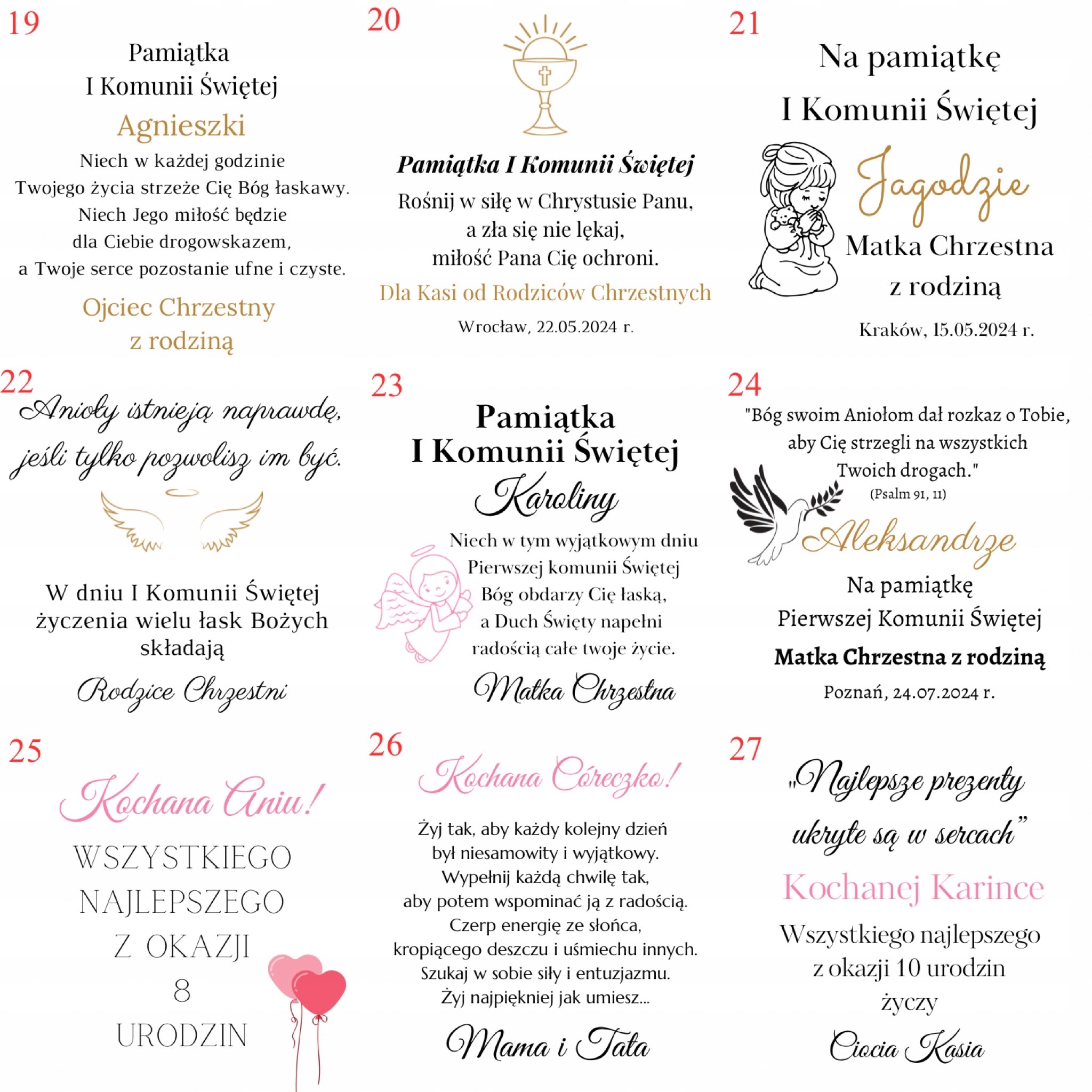 Дитина , яка буде змінена, наприклад, Hani, Antosi, Oliwia (стосується більшості посвячення). Номер поля напр. 5 З нагоди хрещення, 6 причастя або 1 рожева компанія.