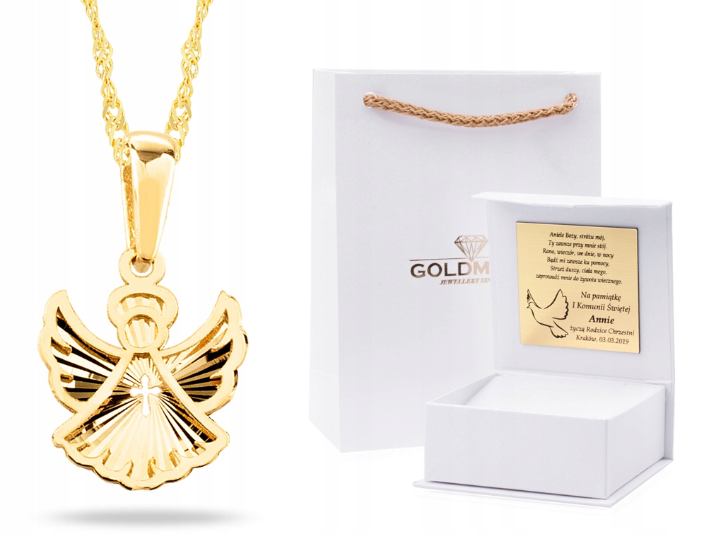 Золотий набір, медаль із ланцюжком повністю виготовлений із золота 585 проби. Набір ідеально підходить для таких випадків, як Святе Хрещення або Причастя. З безкоштовним гравіюванням подарунок стане ще більш індивідуальним. Пропоновані нами ювелірні вироби найвищої якості. Фотографії є нашими, вони показують саме той продукт, який ви купуєте! З кожною покупкою ви безкоштовно отримуєте вибрану коробку з гравіюванням.