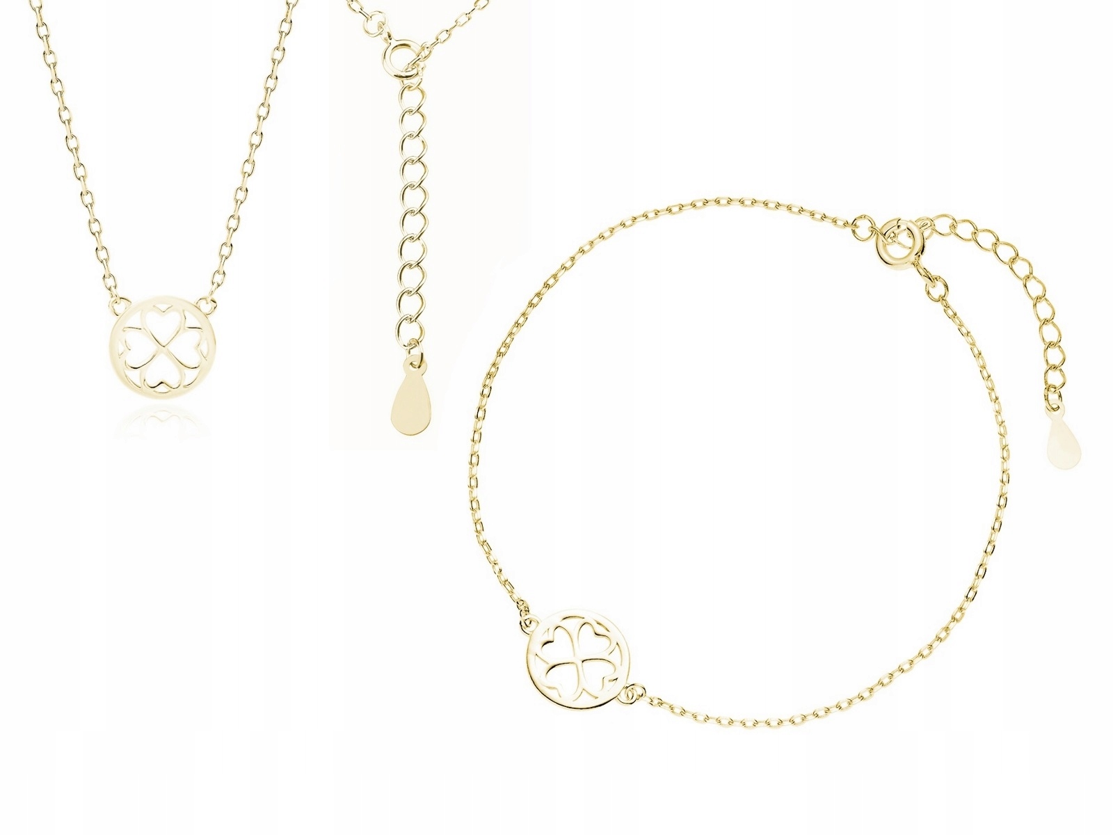 Елегантний набір зірочок із позолоченого срібла, що складається з намиста та браслета, прикрашеного мотивом конюшини із з’єднаних сердець, розміщених у колі.