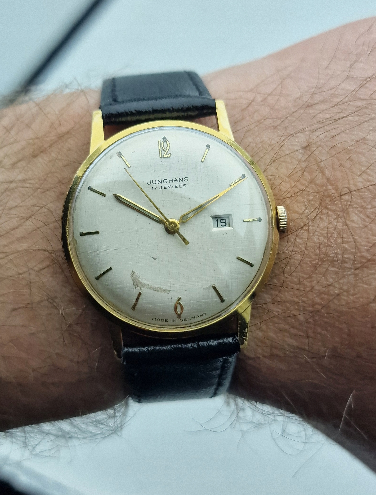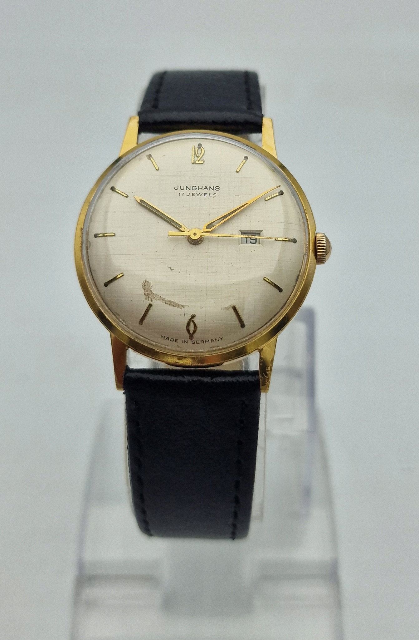 - Срібний металевий диск із золотими годинами та штампом побачень о третій годині. Оригінальний щит, підписаний: " junghans, 17 коштовностей, зроблені в Німеччині ". Щит у дуже хорошому стані, як на знімках.