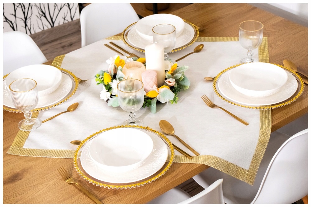 Додати стиль та елегантність до свого столу завдяки цьому унікальному протектору! Матеріал ECRU в поєднанні з золотим блискучим берегом робить його ідеальним для урочистих випадків, таких як свята, весілля або романтичні вечері. Особливості продукту