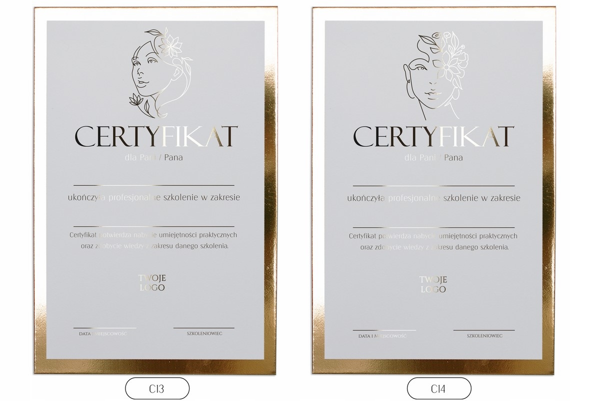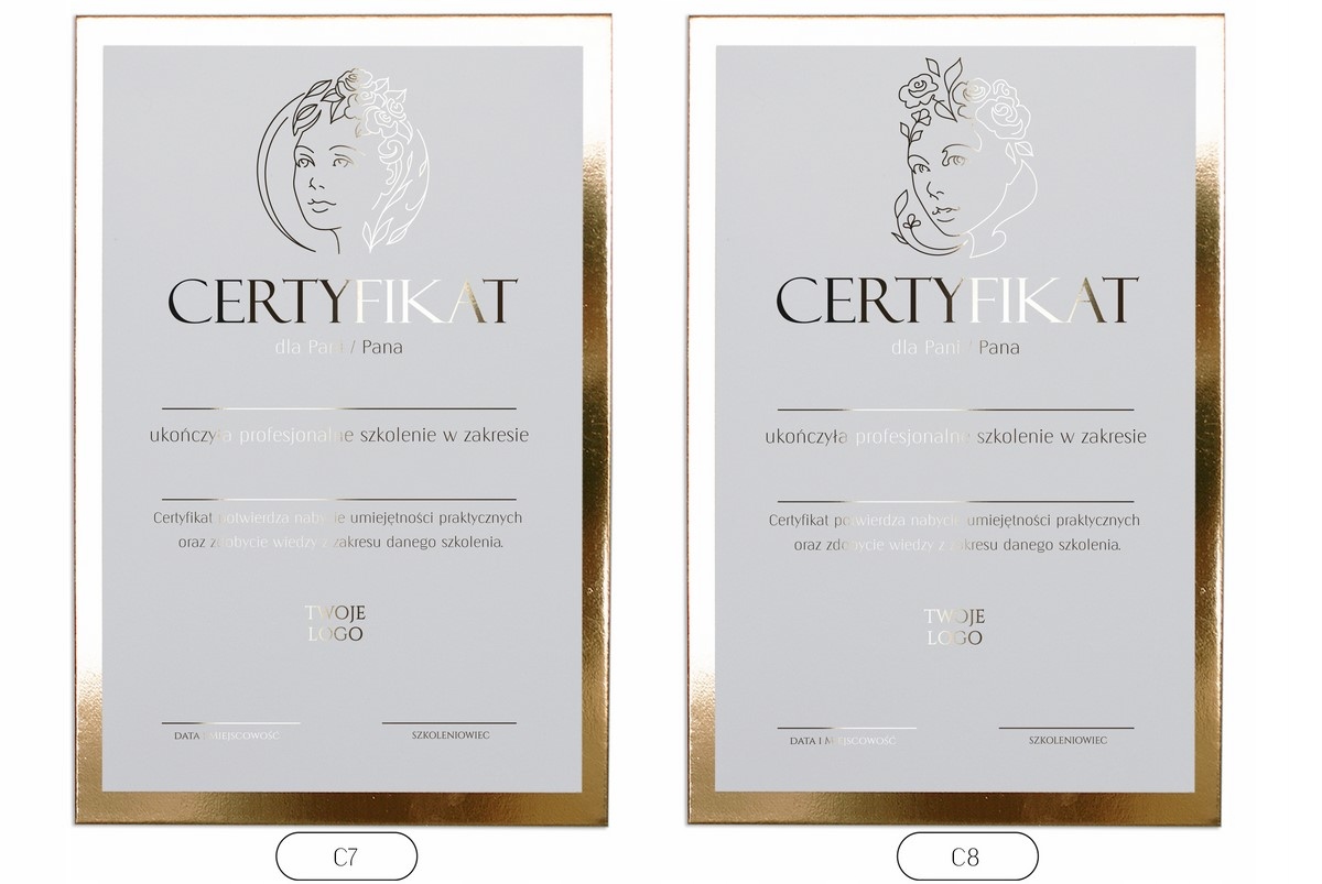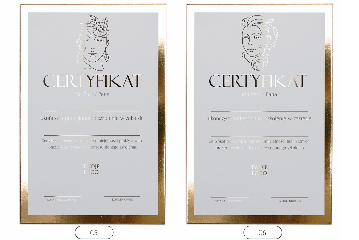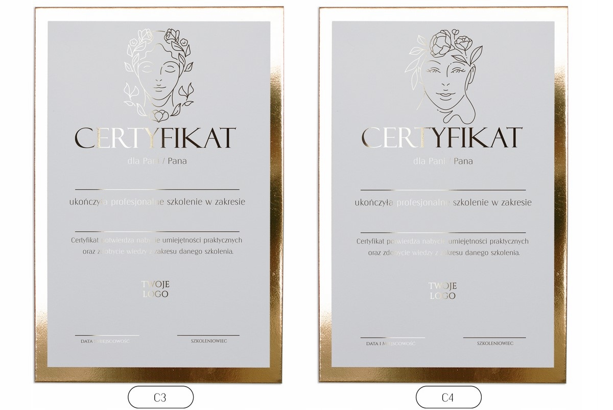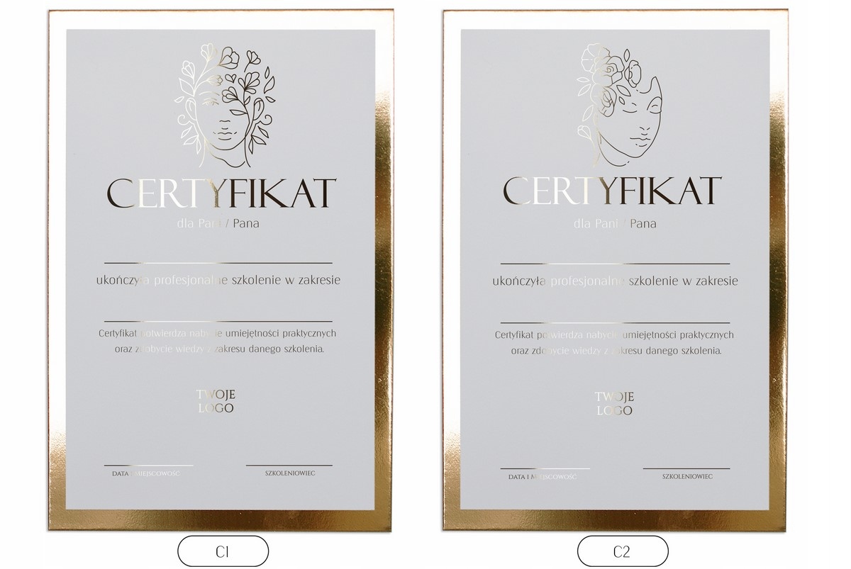 Сертифікат повністю вдосконалюється з фольгою у вибраному кольорі замовником. Срібний, фіолетовий, зелений, синій, мідний, бордовий, рожевий золото, фуксія, голографічна