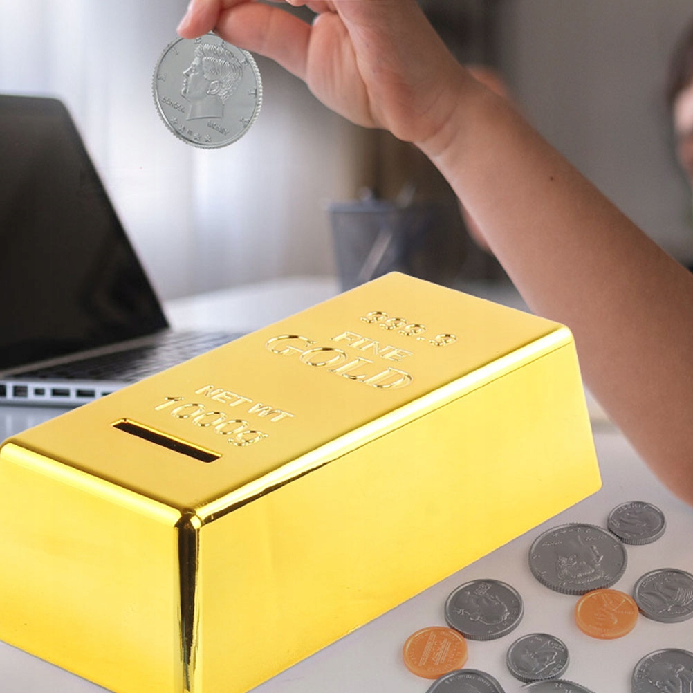 ✅Ця скарбничка із золотим злитком виготовлена з пластику, який є міцним і ідеальним у використанні.