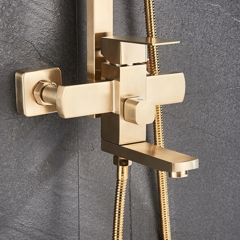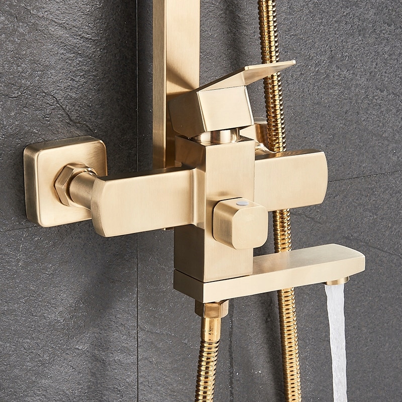 Золотий змішувач для ванної кімнати обладнано тропічним душем, який розміщено над головою користувача. Вода, що витікає з квадратного тропічного душа, приймає форму дощу, приємно кроплячи голову і тіло. Він справляє враження масажу та забезпечує неймовірне розслаблення.