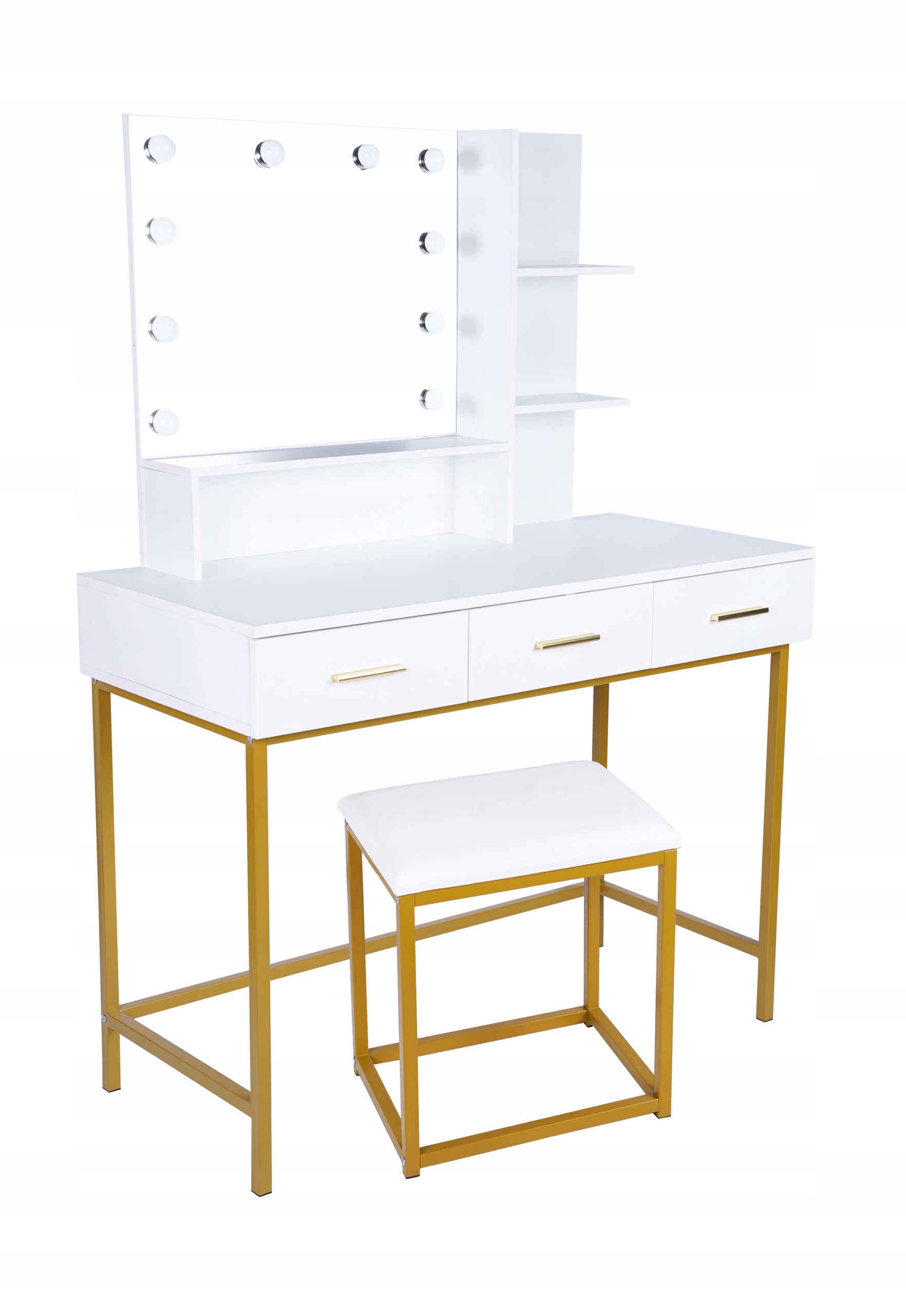 Модний і практичний туалетний столик від Meble Moskała в м. білий зробить ваш інтер'єр більш привабливим. Золоті аксесуари додадуть вишуканості і точно впишуться в багато композицій. Якщо ви шукаєте сучасний і практичний предмет меблів, то туалетний столик Selena ідеально підходить для вас!