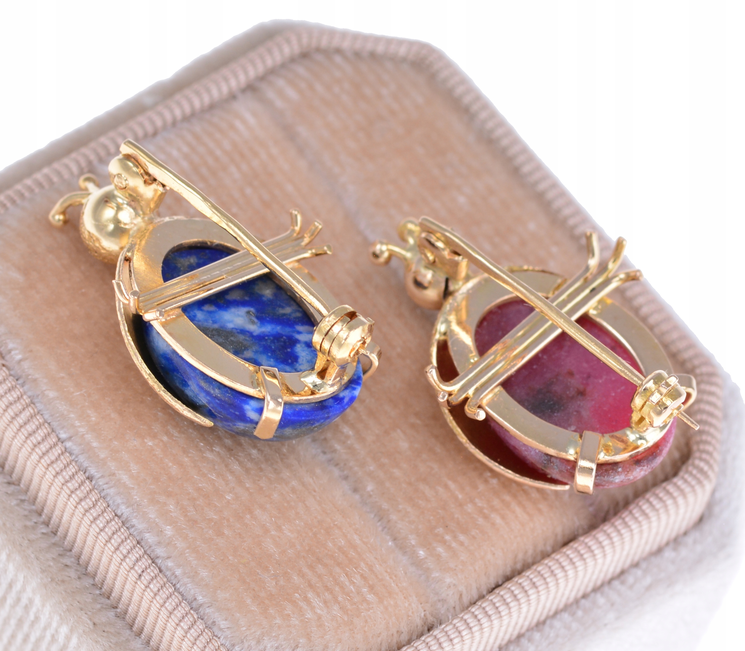 Предметом продажу є дві чарівні брошки в форми жуків. Брошки із золота вищої проби прикрашені камінням лазурит (темно-синій) і родохрозит у вигляді кабошона. Ціна вказана за одну брошку, після покупки напишіть, який колір ви обираєте.