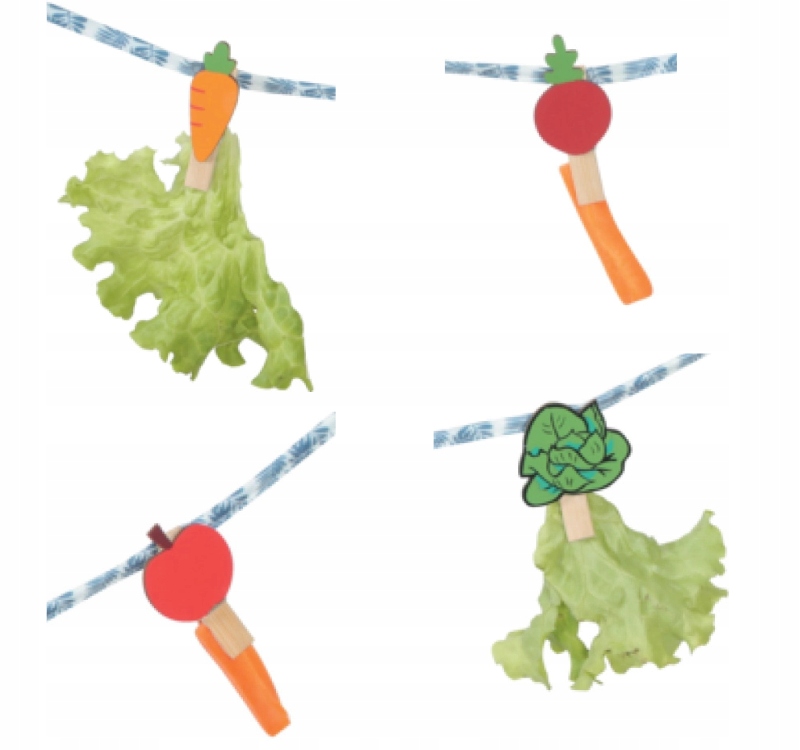 🥕 дерев’яні пряжки - 4 барвисті, у формі овочів, дозволяють легко повісити улюблені частування.