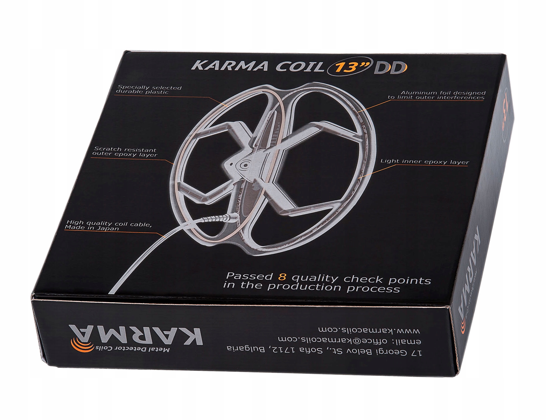 Завдяки котушці можна отримати ширше поле розгортки та діапазон, збільшений до 30%, залежно від типу детектора. Зонд Karma використовує високоякісний японський кабель, що забезпечує більшу стабільність під час роботи в Зона, де є електромагнітні перешкоди, заповнена епоксидною смолою. Зонд покритий захисним покриттям для захисту котушки від пошкоджень. Котушка призначена для детекторів Garrett 150/250/350(Euroace)/200i/300i/400i.